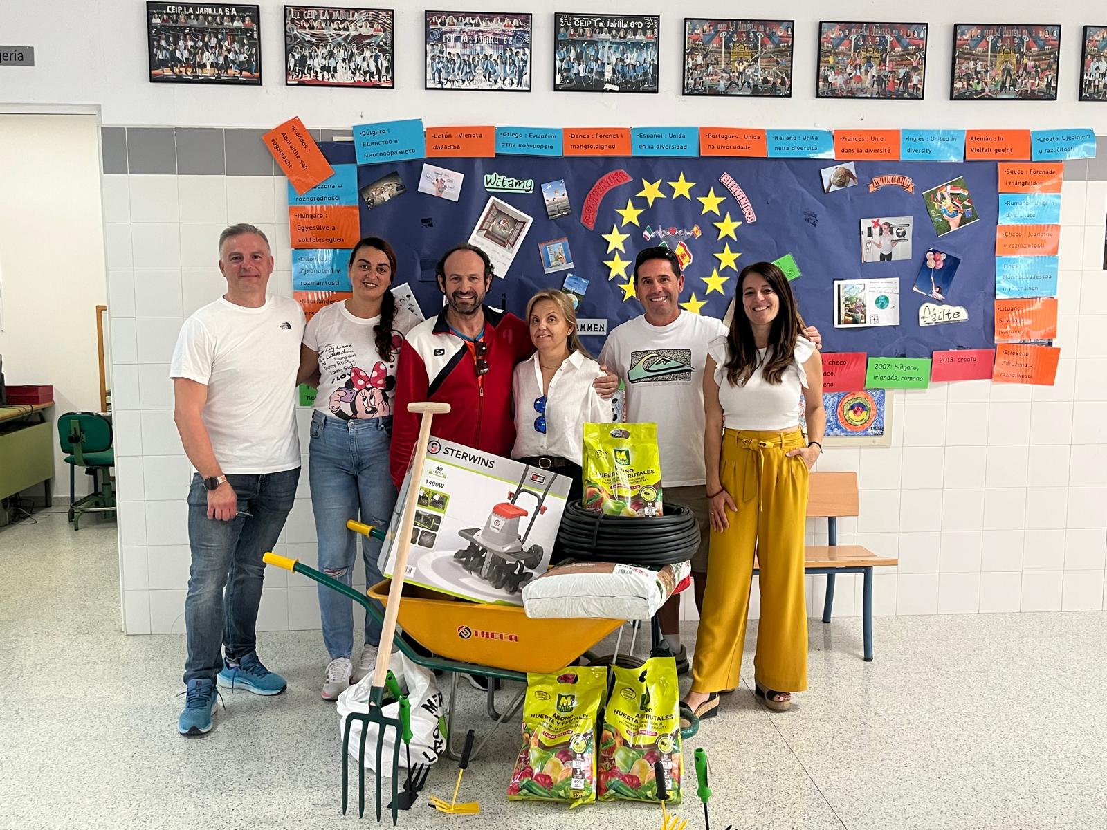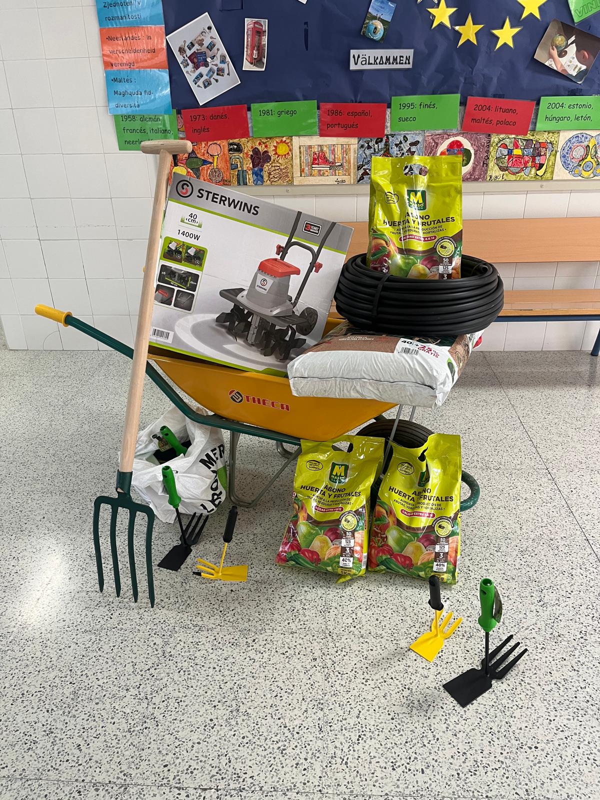 Por valor de 300€ se hizo entrega de una moto-azada eléctrica, 14 almocafres, una horca, diferentes tipos de manguera para riego por goteo, goteros, etiquetas para plantas, abono ecológico y sustrato.