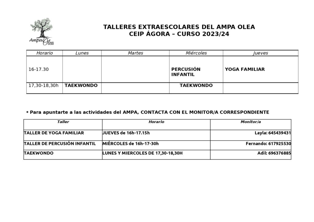 Para el curso 2023/2024, desde este AMPA, ofrecemos los siguientes talleres extraescolares: YOGA FAMILIAR, y TAEKWONDO. Si te interesa alguno, por favor contacta directamente con el monitor que se indica, o solicítalo en ampaolea.palomares@gmail.com