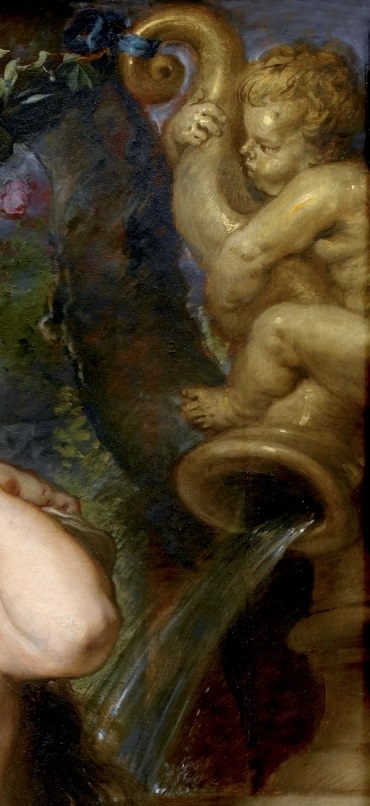 A la derecha, en forma vertical, hay una fuente decorada con un cupido encima de una cornucopia dorada que derrama agua.