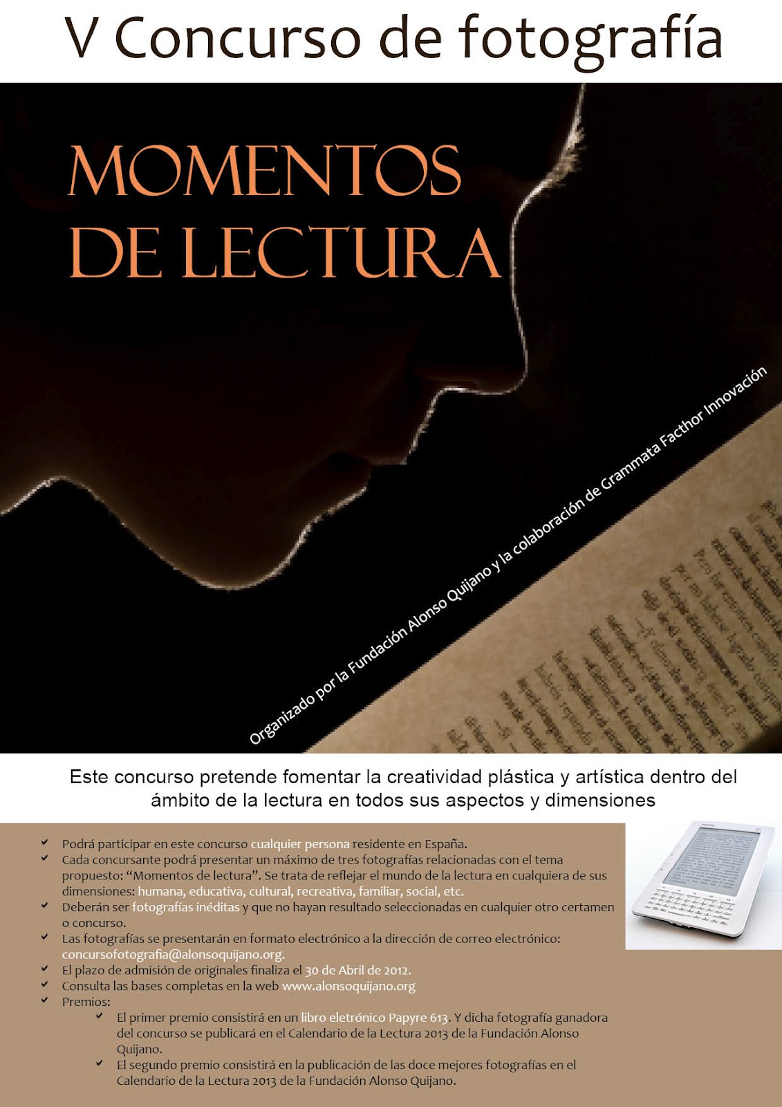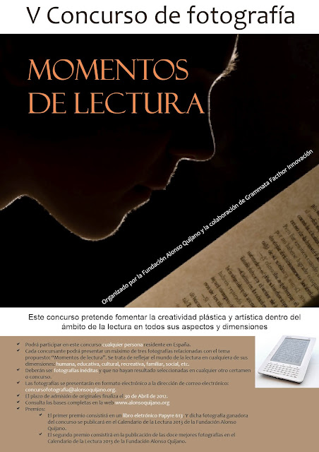 La finalidad del concurso es la selección de fotografías relacionadas con la lectura para la publicación en el Calendario de la Lectura 2013 de la Fundación Alonso Quijano (aquí el calendario del año anterior). El plazo de admisión de originales finaliza el 20 de abril.