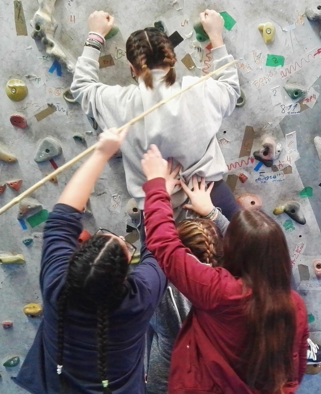 Tras una breve explicación de los principios de las distintas modalidades de escalada en un rockódromo por parte de los monitores de la instalación, que supervisaron los progresos de los alumnos, éstos se aplicaron con entusiasmo y dedicación a la tarea.