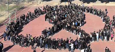 Además, el día 24, viernes, en el recreo, hubo muchos actos (remitimos, de nuevo, al enlace ya mencionado) y el remate fue el lazo humano que los alumnos realizaron en el patio, inmortalizado magistralmente desde el ático del Centro por la profesora y gran fotógrafa Belén Ramajo, del Departamento de Física y Química: