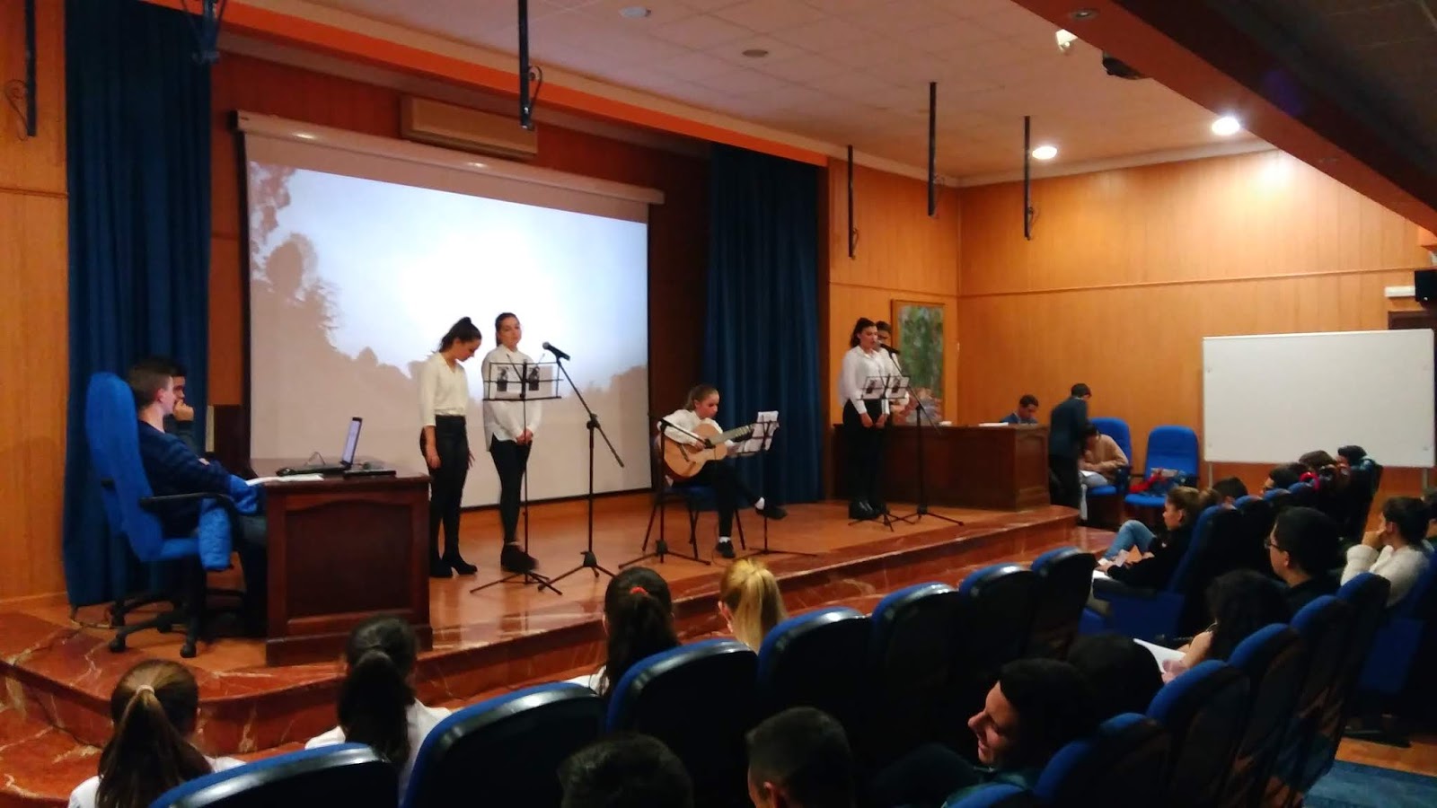 producción propia, como los de 4º ESO C), y otros acompañando con instrumentos musicales, como piano, saxofón o guitarra. Por otra parte, ocho alumnos de la asignatura de Oratoria y Expresión Oral (2º Bachillerato B y C) se encargaron de la presentación y aspectos técnicos (sonido, imagen, vídeo y escenario).Aprovechando que el 25 de noviembre era el Día de la No Violencia de Género, centramos la temática en la mujer. Así, se abordaron temas