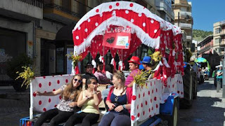 Chaque association, famille ou groupe d’amis décorent leur char. Elles en gitane avec la robe flamenco typique et eux avec un costume au pantalon court.