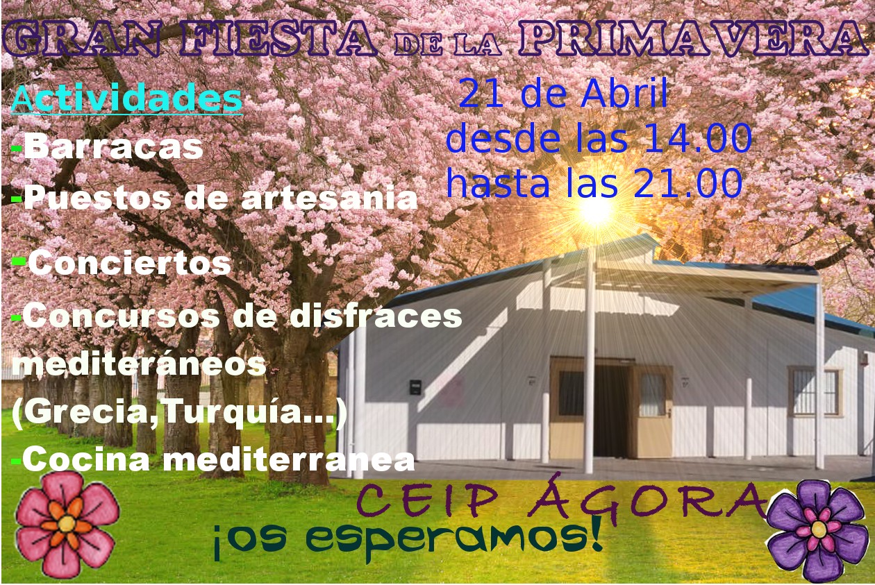 Tenemos el placer de invitar a toda la comunidad educativa a la próxima fiesta de la primavera que se va a celebrar en nuestro centro el próximo viernes día 21 de marzo una vez finalizada la jornada escolar. En dicha fiesta podréis disfrutar de múltiples comidas y bebidas además de barracas de juegos, puestos de artesanía, concurso de disfraces con motivo de la celebración (cultura mediterránea) , concierto de «Los Flutedogs», taller de maquillaje egipcio, de trenzado grecorromano y muchas sorpresas…