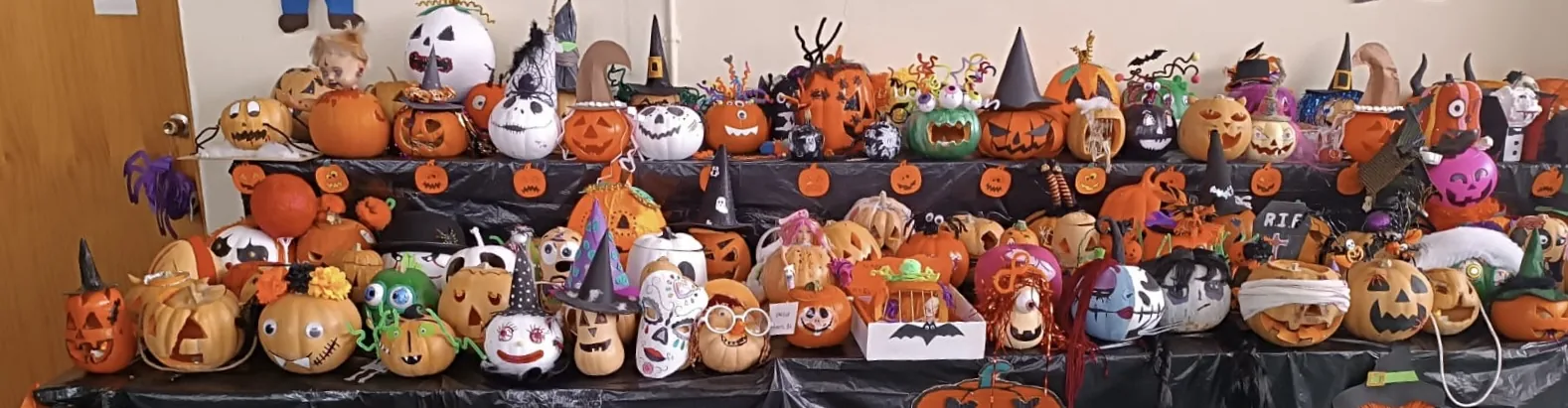 El alumnado de 3º, 4º, 5º y 6º visitó el Pasaje del Terror instalado por el Ayuntamiento en el pabellón polideportivo, mientras que todo el colegio, incluido Infantil, disfrutó de la exposición de calabazas y del photocall terrorífico que preparó con mucho cariño nuestro AMPA.