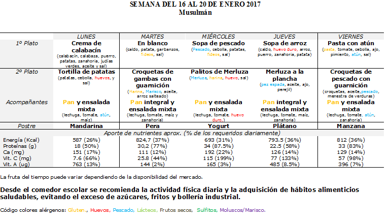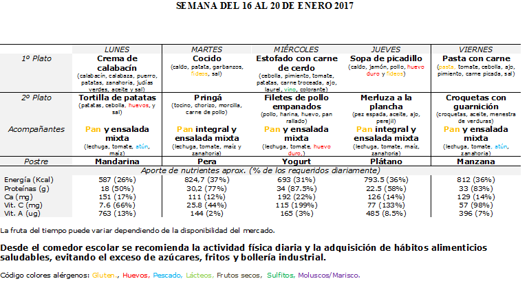MENÚ COMEDOR DEL 16 AL 20 DE ENERO DE 2017