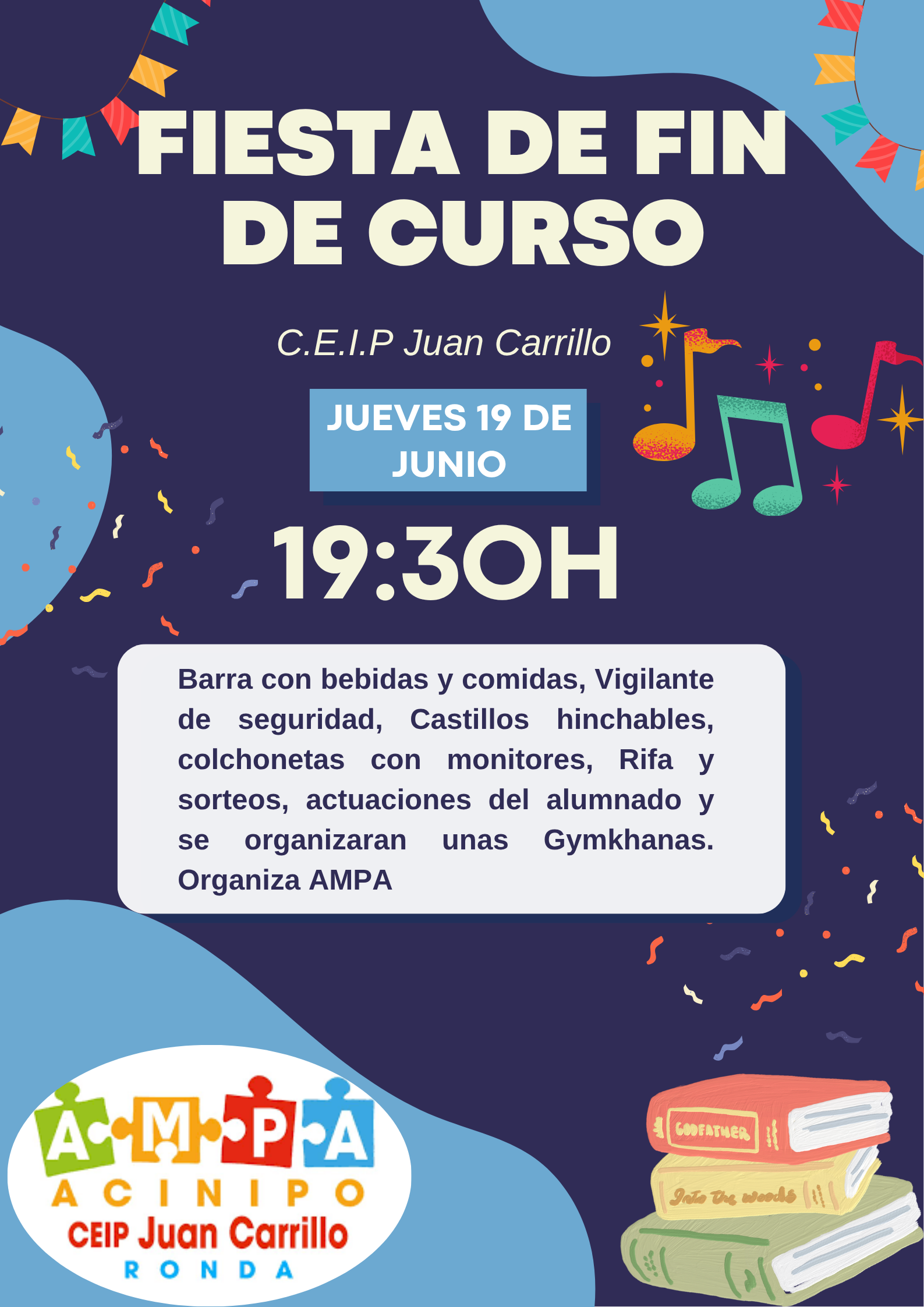 El próximo 19 de junio se llevara acabo la fiesta de fin de curso del colegio C.E.I.P Juan Carrillo, a las 19:30 se abrirán las puertas del centro y tendra barra con bebidas y comidas, Vigilante de seguridad, Castillos hinchables, colchonetas con monitores, Rifa y sorteos, actuaciones del alumnado y se organizaran unas Gymkhanas. Organiza AMPA