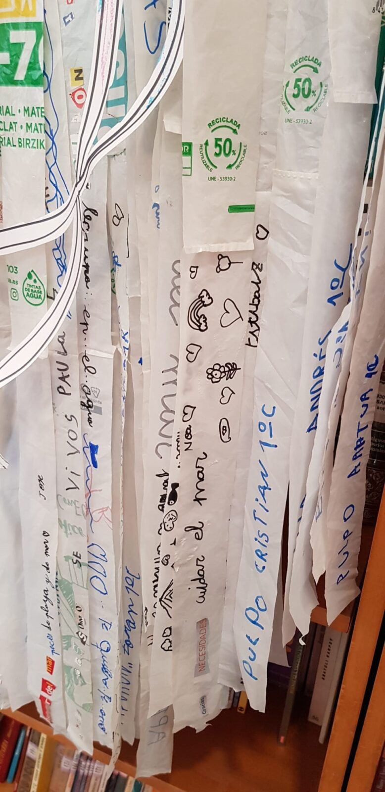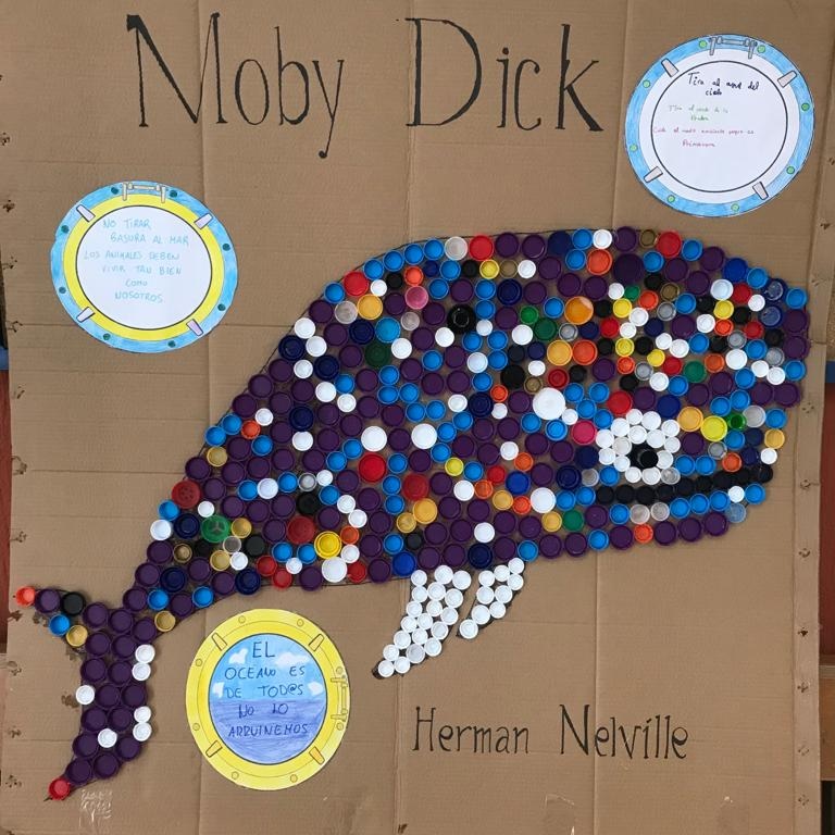 Cuarto curso ha elaborado un cachalote gigante lleno de tapones de plástico reciclado, en base al libro «Moby Dick» con mensajes de cuidado de océanos.