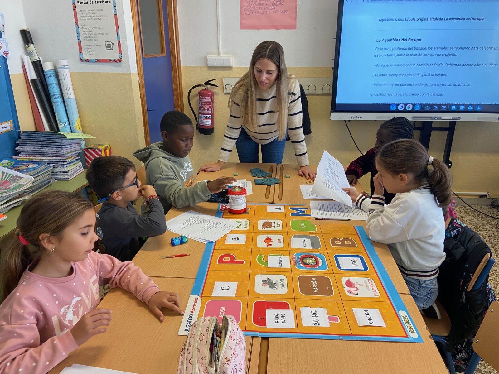 Cada vez que un equipo responde correctamente, accede a la Pizarra Digital Interactiva (PDI) para construir un tangram digital 🧩, integrando así el aprendizaje manipulativo y visual.
