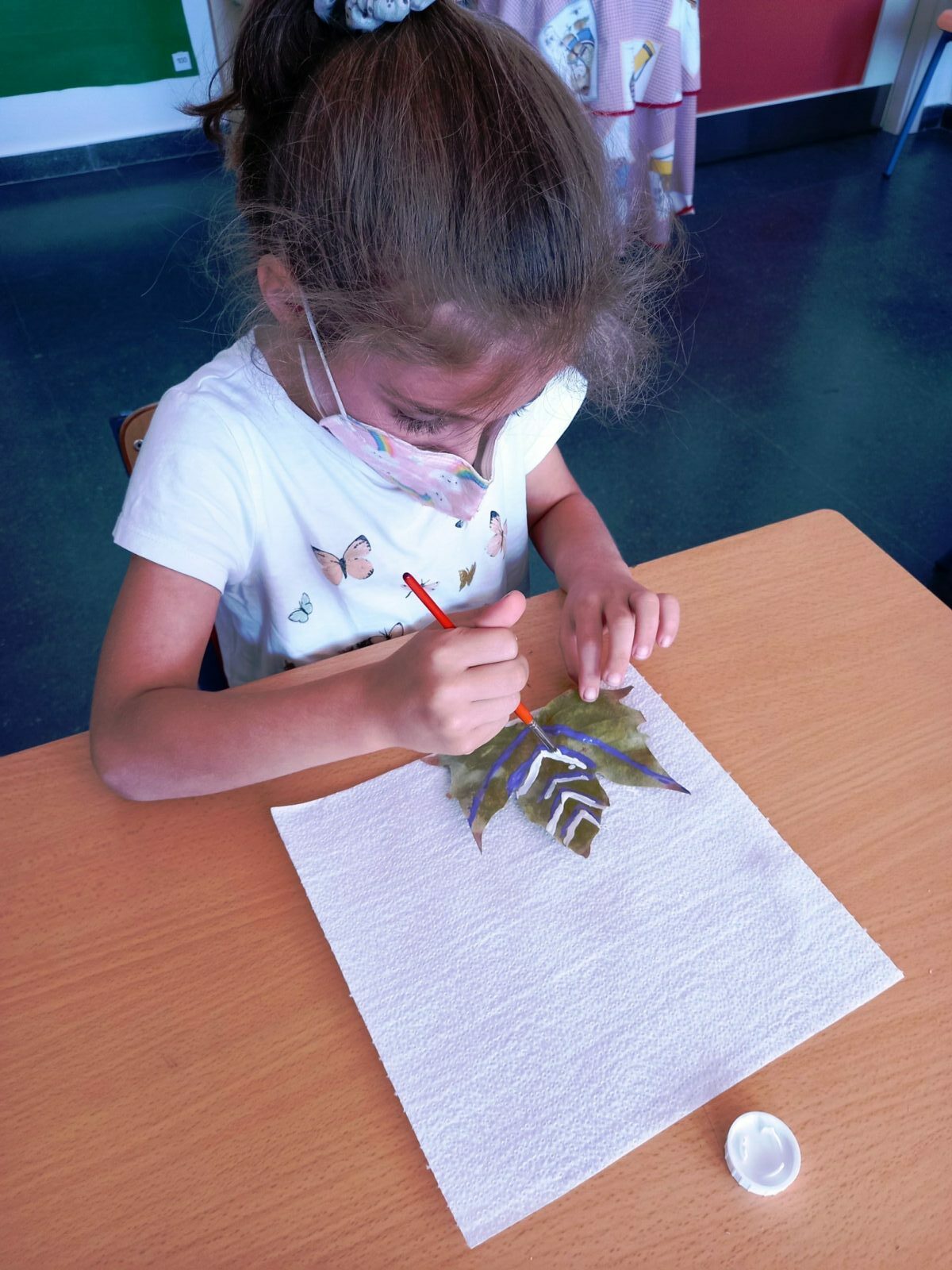 Pintamos las hojas que recogisteis de parques, patios y calles de nuestra localidad y las decoramos con los colores del otoño.