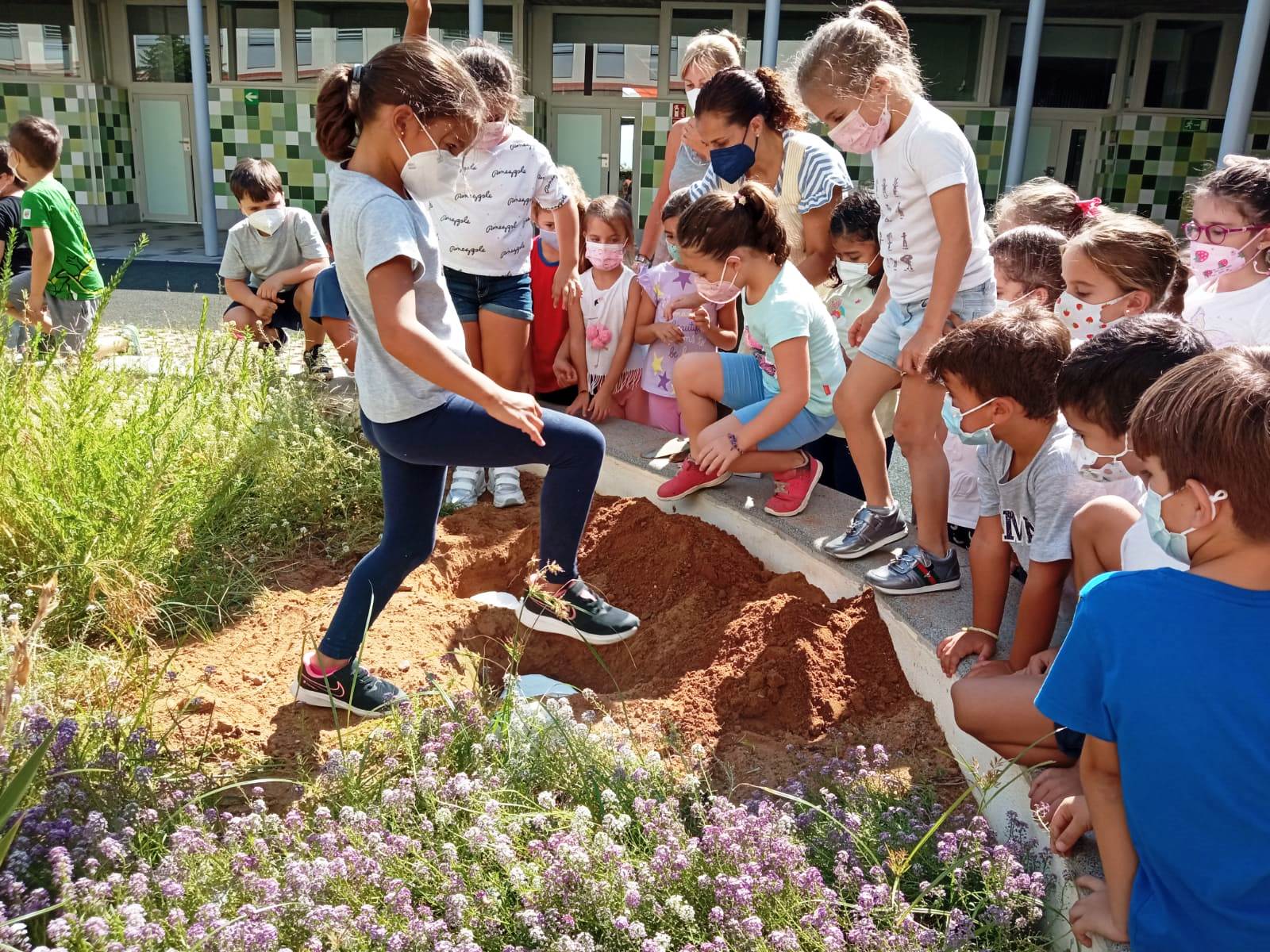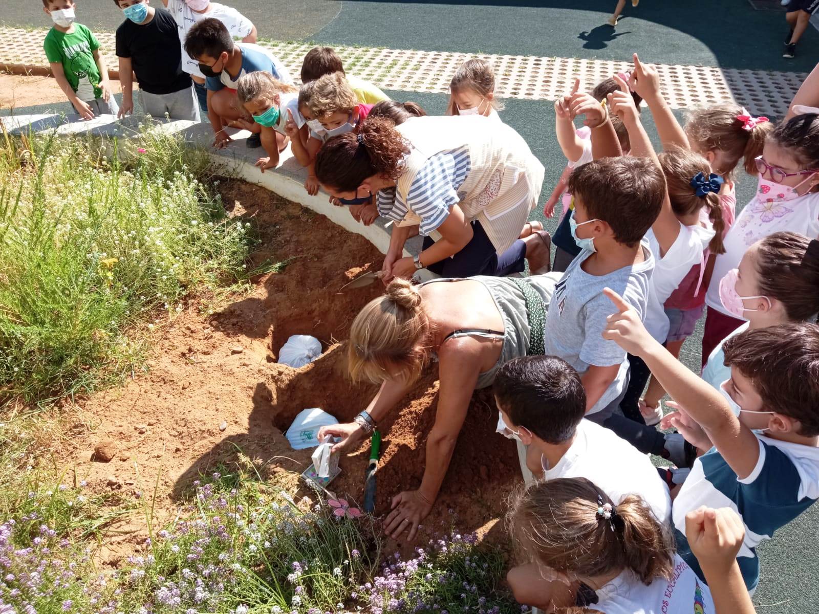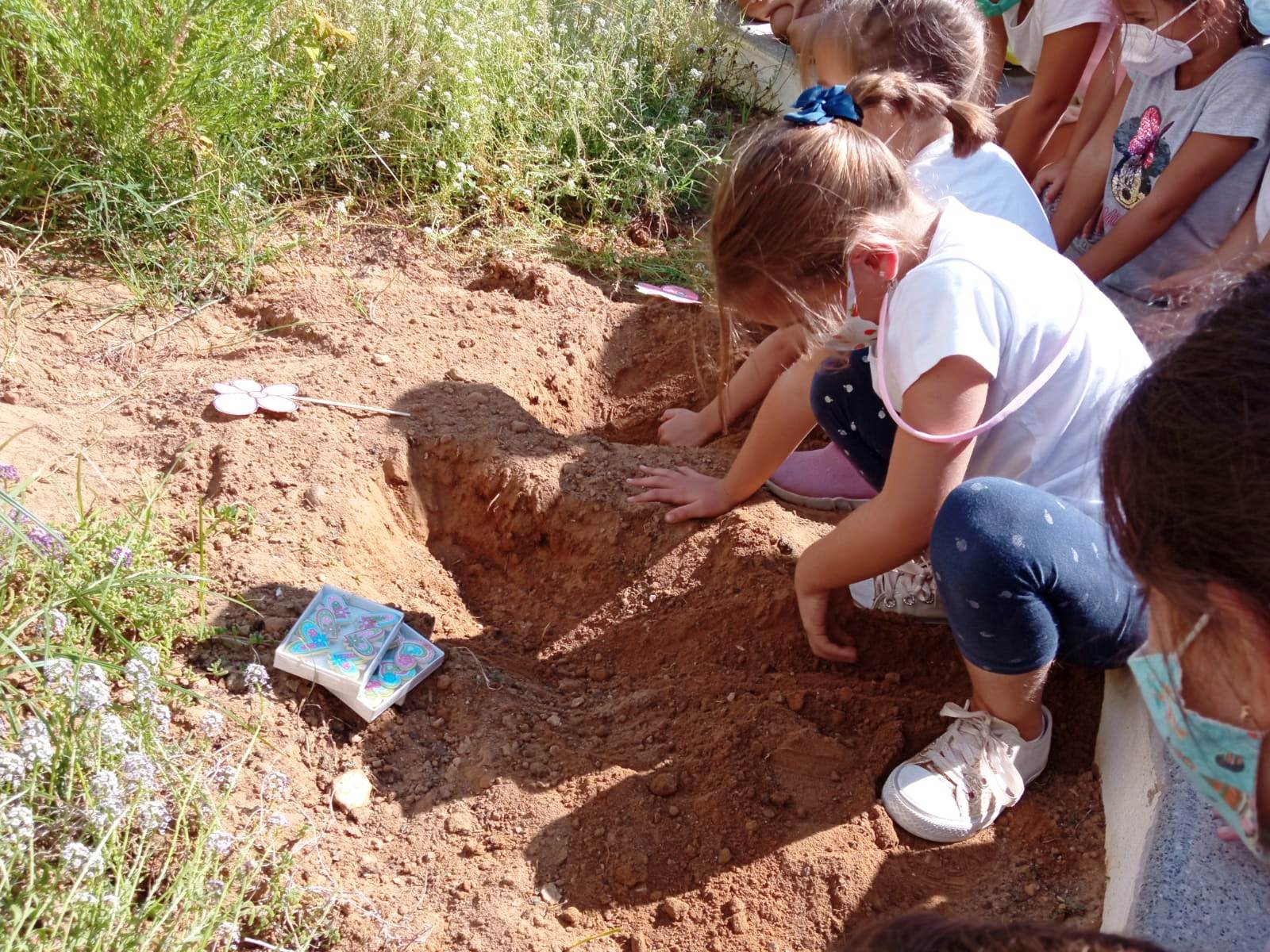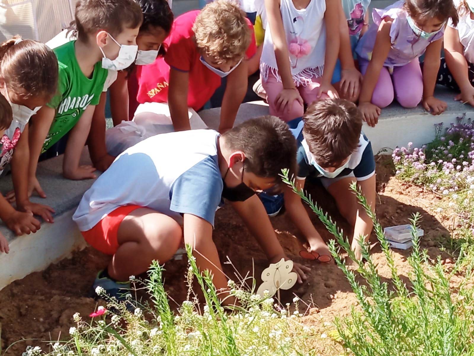 Guardamos las cometas en una caja y enterramos ésta en un sitio privilegiado, al cobijo del “árbol de Paula”, que tanto cariño le tenemos. ¡Qué suerte tuvimos cuando fuimos a enterrar las cajas! ¿Sabéis por qué? Porque encontramos en la tierra una mariposa y una flor, que son los símbolos respectivos de los grupos de 1ºA y 1ºB y con ellos cajitas de mariposas y de corazones ¡Qué emoción! ¡Nos pusimos tan contentos/as!