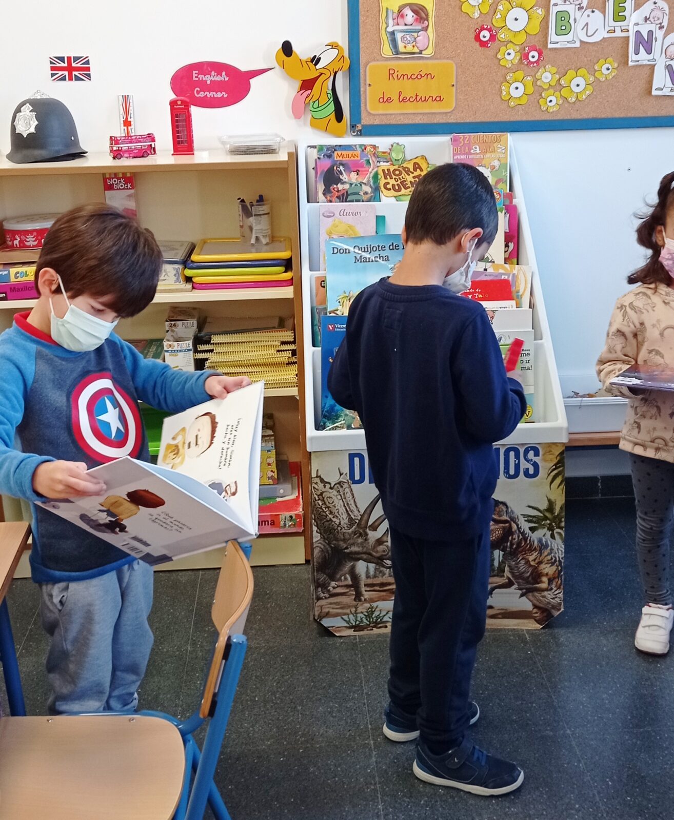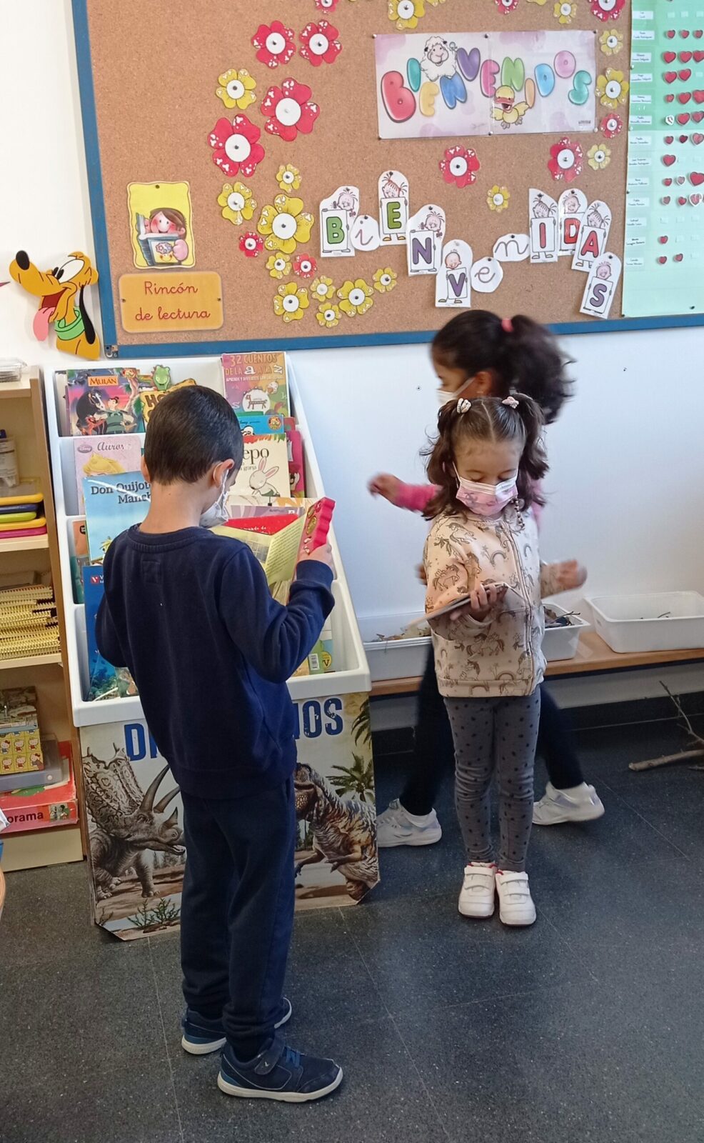 Cuando suena la música a las nueve menos diez y el alumnado va entrando con fluidez en el aula por lo de las medidas y protocolos COVID, van buscando un huequecito en la asamblea -que está junto al expositor de libros- en el rincón de lectura y allí se van uniendo los/as que van llegando.