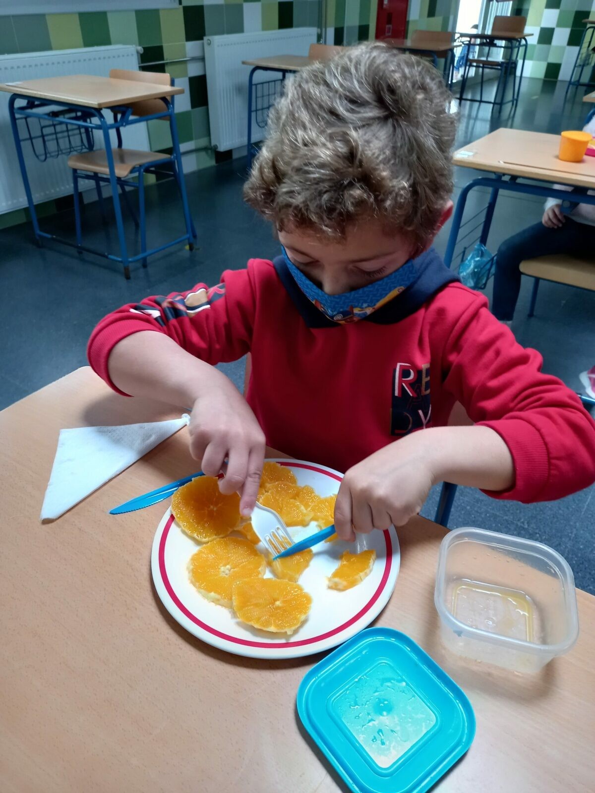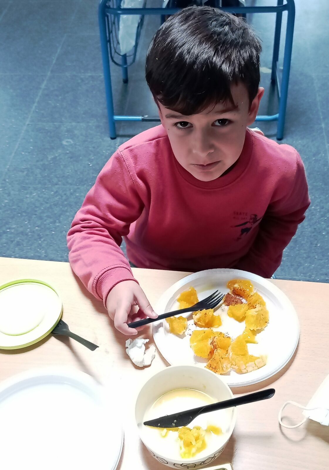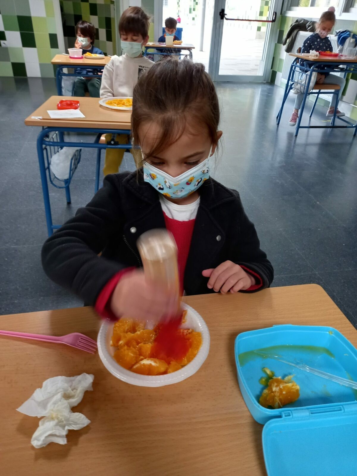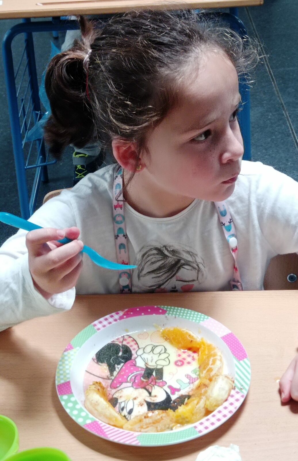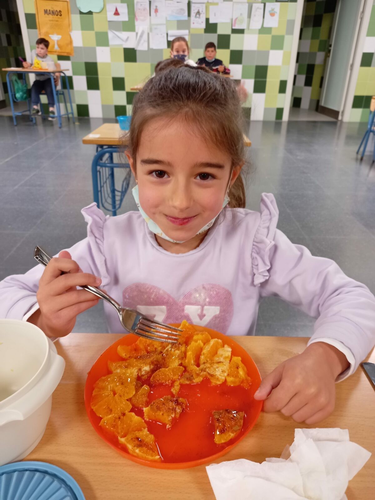 Las fotos que compartimos son las de la tarea final en que nos fuimos al comedor y juntos/as hicimos la receta especial: naranja con aceite y canela. Hubo para todos los gustos; a unos/as alumnos/as les encantó y a otros/as no, pero todos/as la probaron, que era nuestra principal intención.