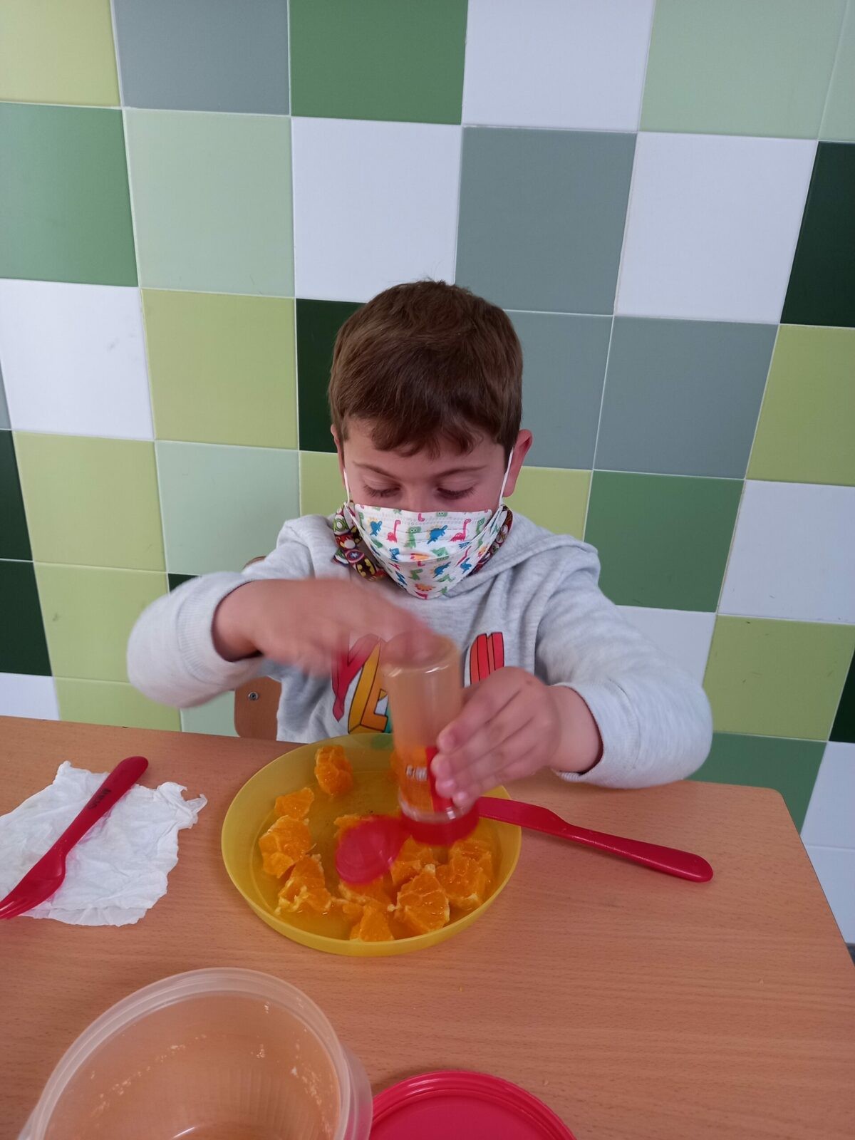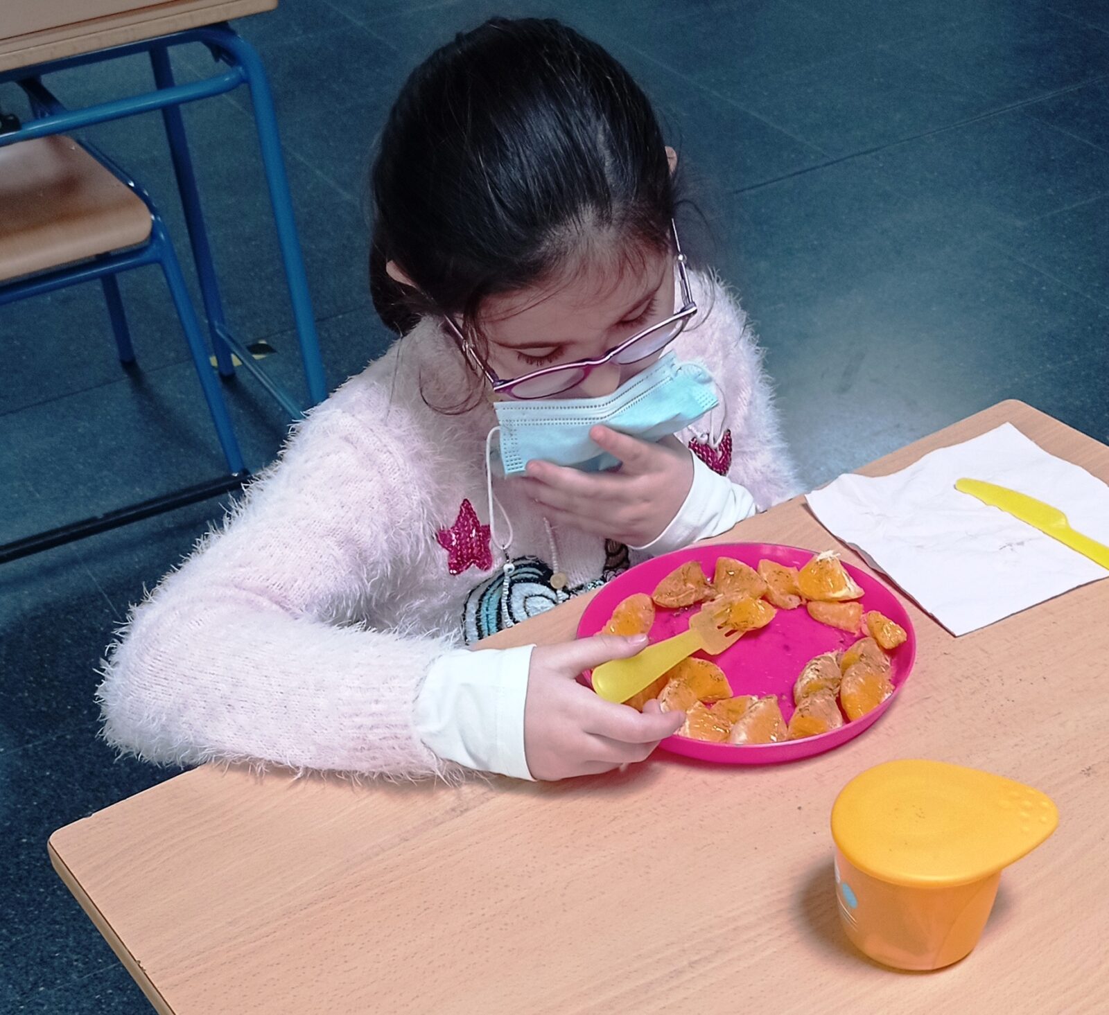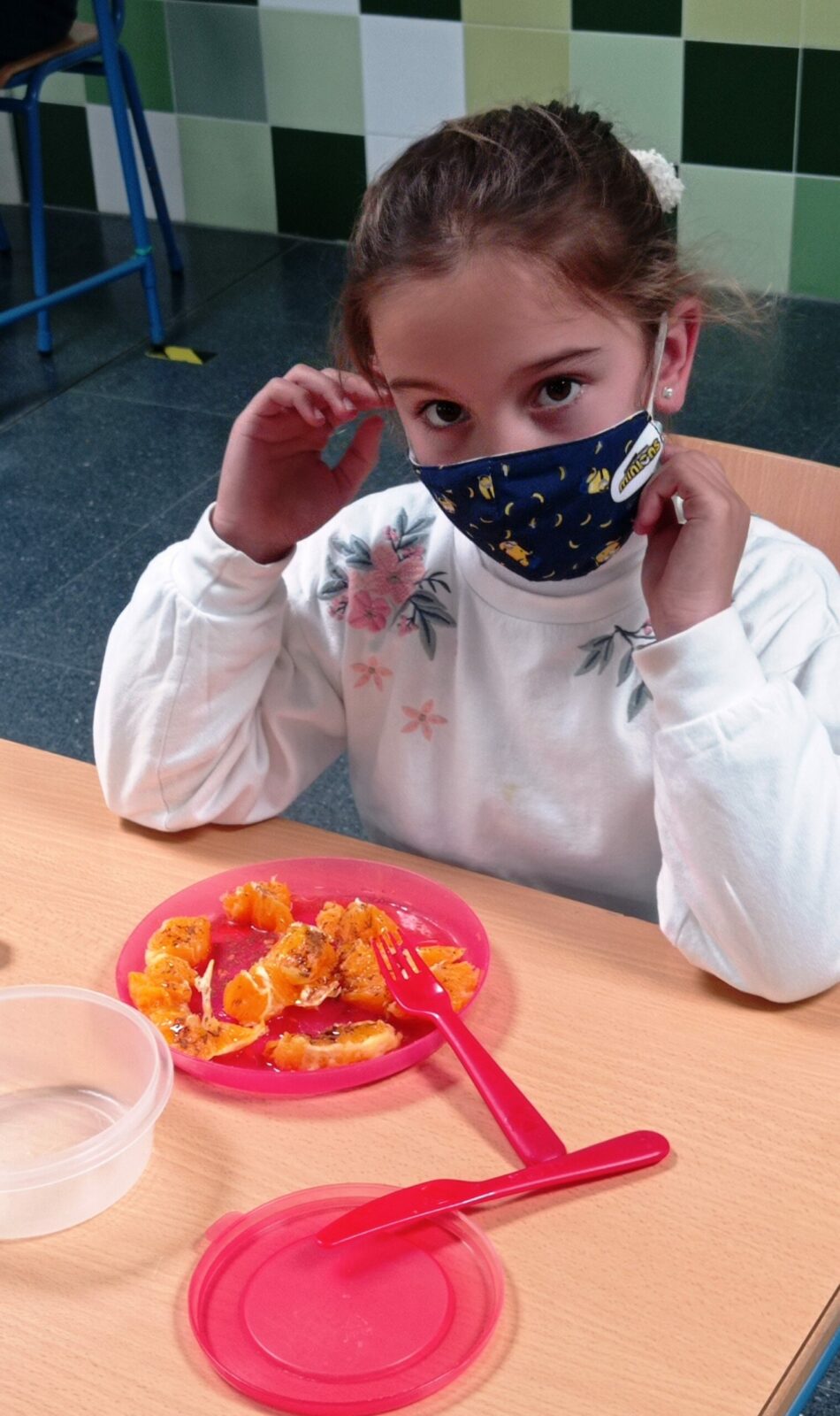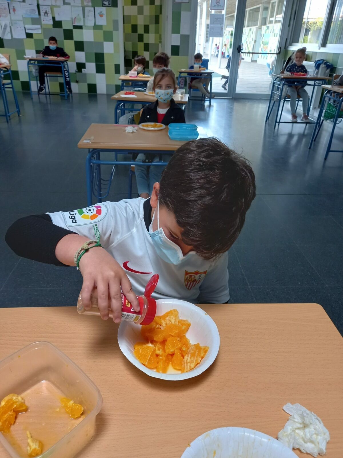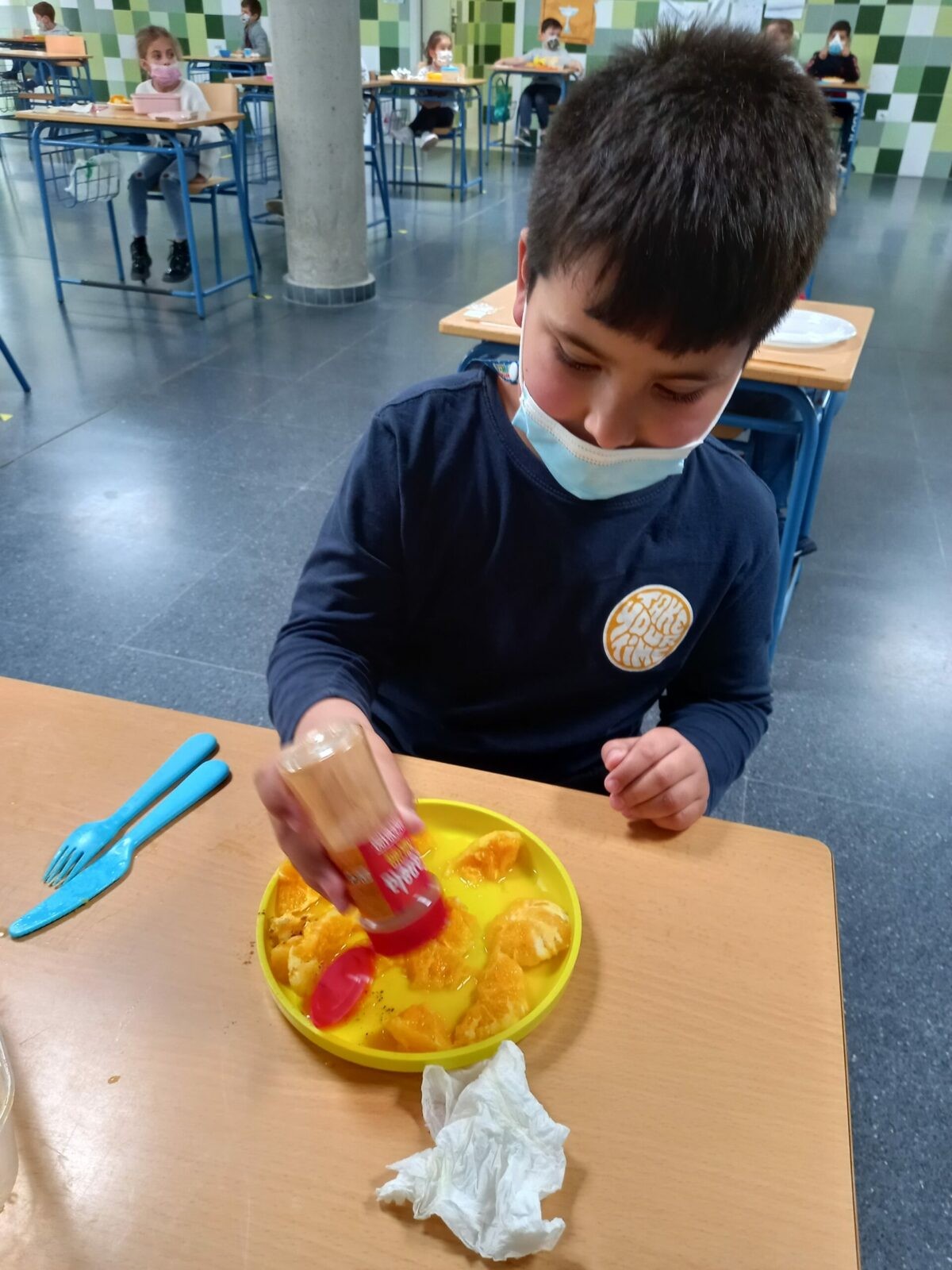 Las fotos que compartimos son las de la tarea final en que nos fuimos al comedor y juntos/as hicimos la receta especial: naranja con aceite y canela. Hubo para todos los gustos; a unos/as alumnos/as les encantó y a otros/as no, pero todos/as la probaron, que era nuestra principal intención.