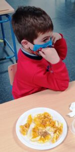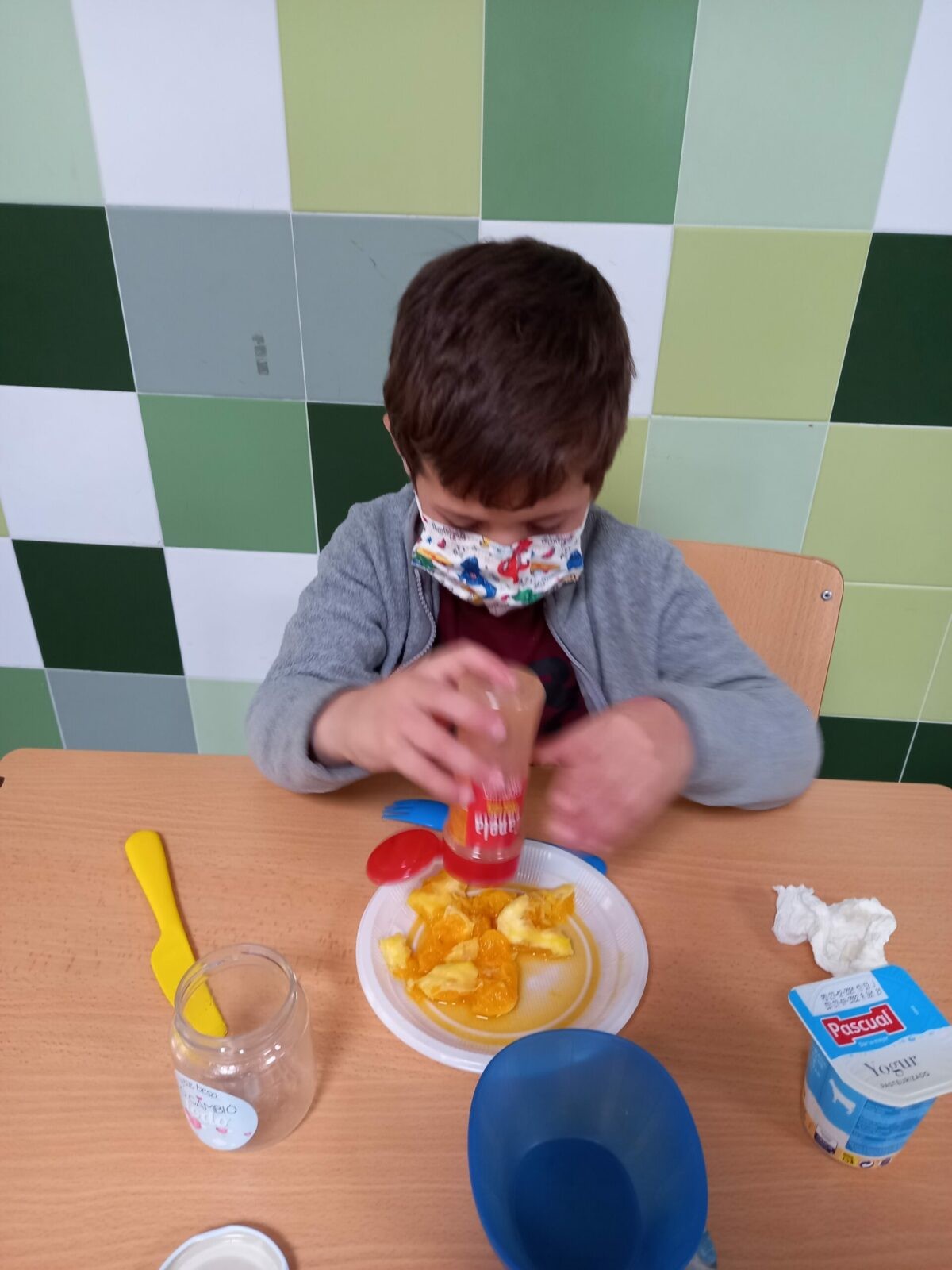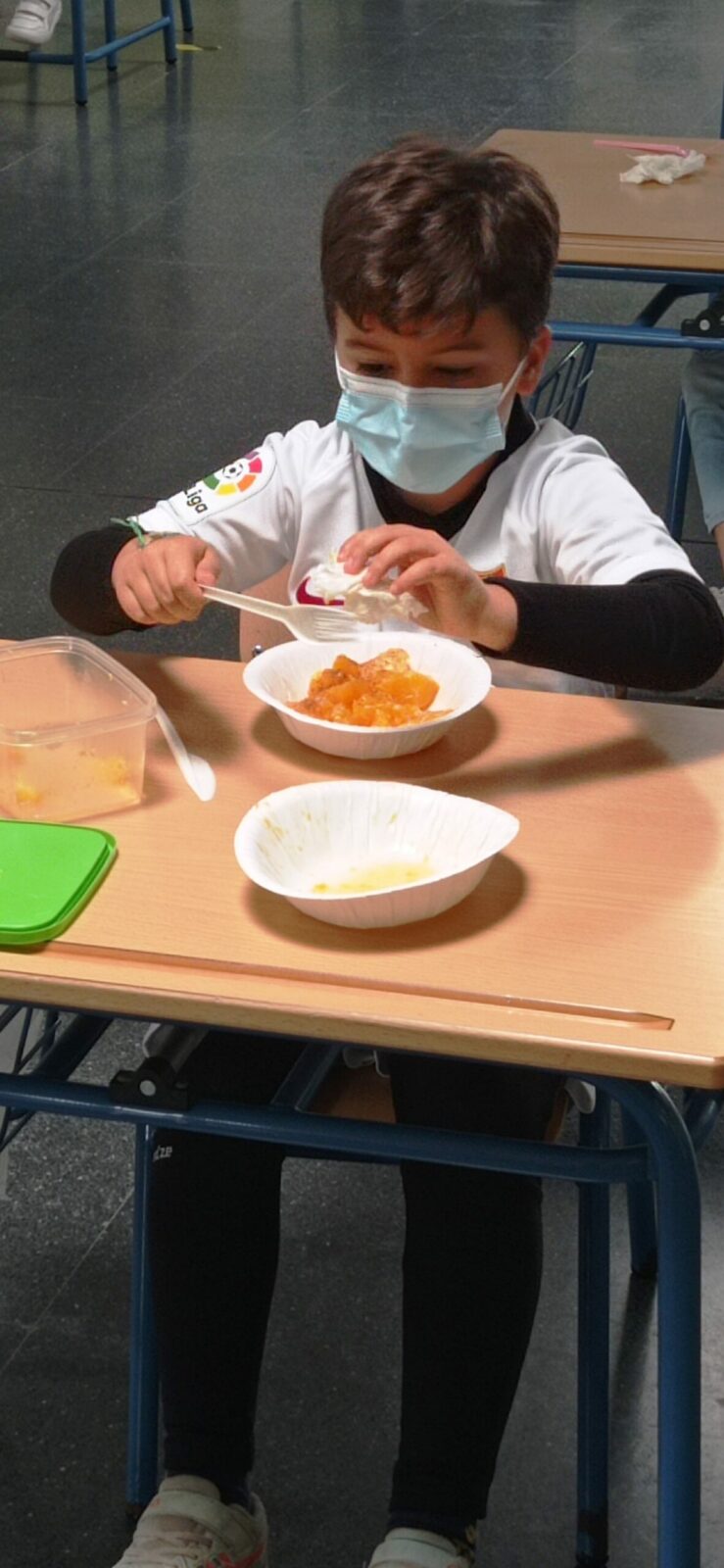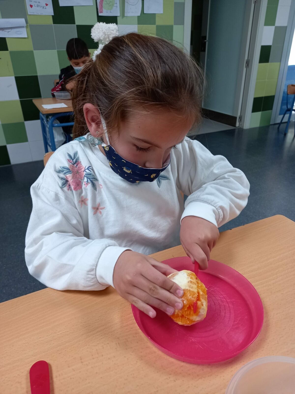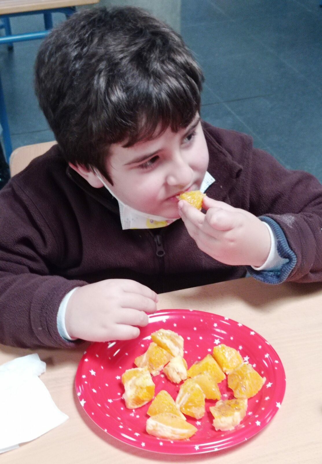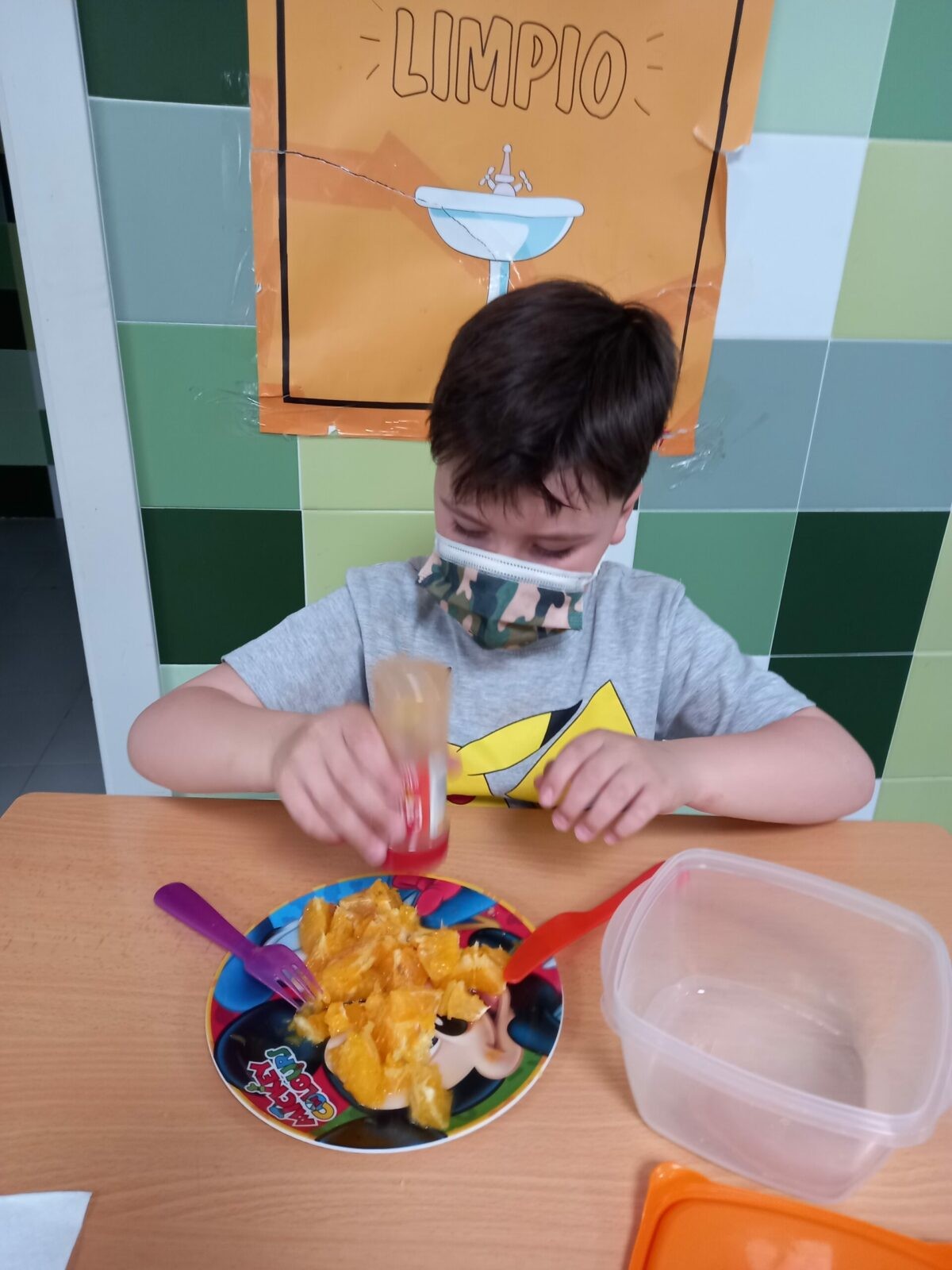 Las fotos que compartimos son las de la tarea final en que nos fuimos al comedor y juntos/as hicimos la receta especial: naranja con aceite y canela. Hubo para todos los gustos; a unos/as alumnos/as les encantó y a otros/as no, pero todos/as la probaron, que era nuestra principal intención.