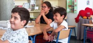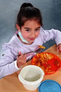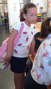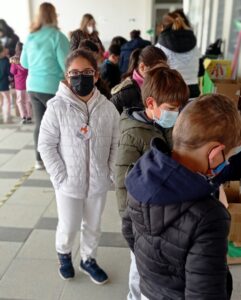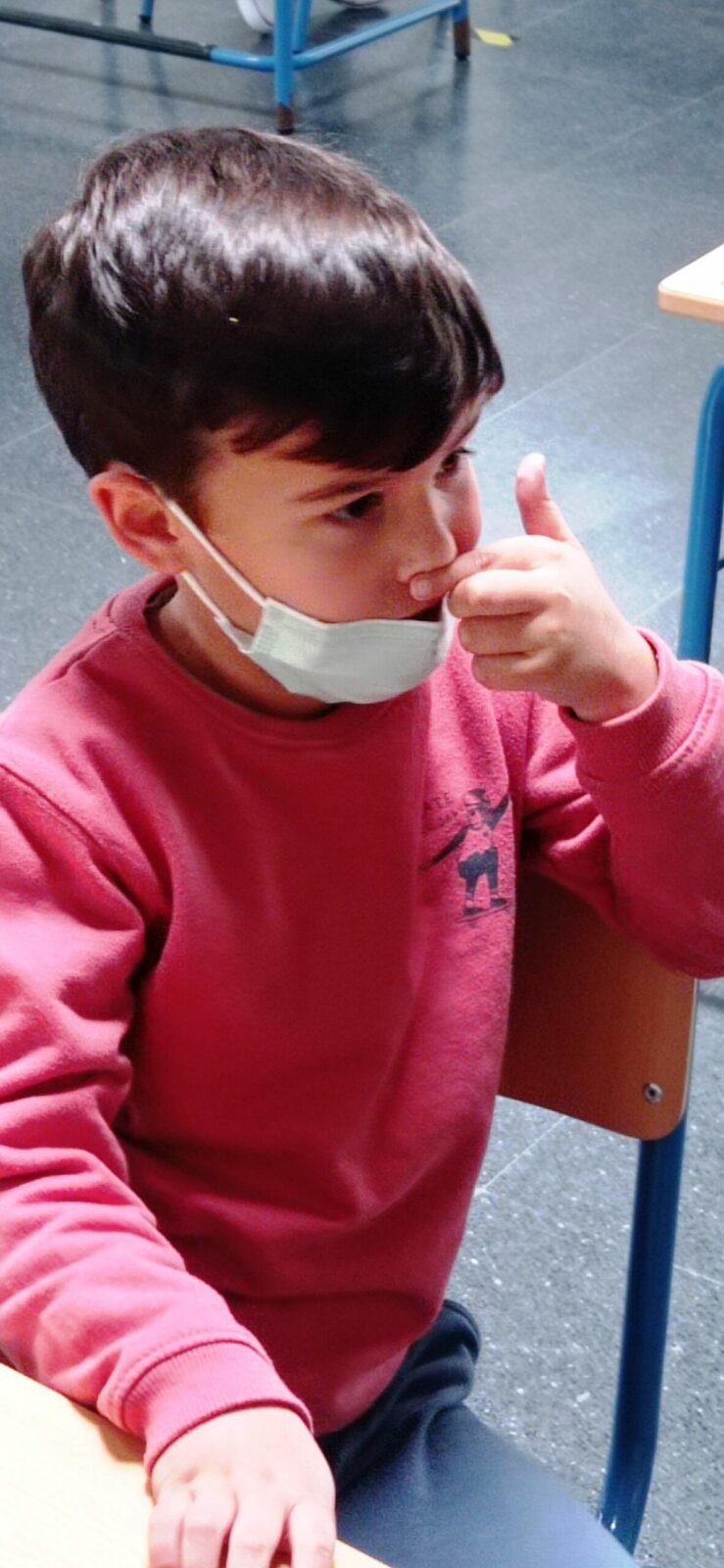 Les hemos recomendado a nuestro alumnado de 1º que el grupo de siente unido y desayune tranquilamente. A medida que terminan de desayunar ya se van levantando para empezar a jugar.
