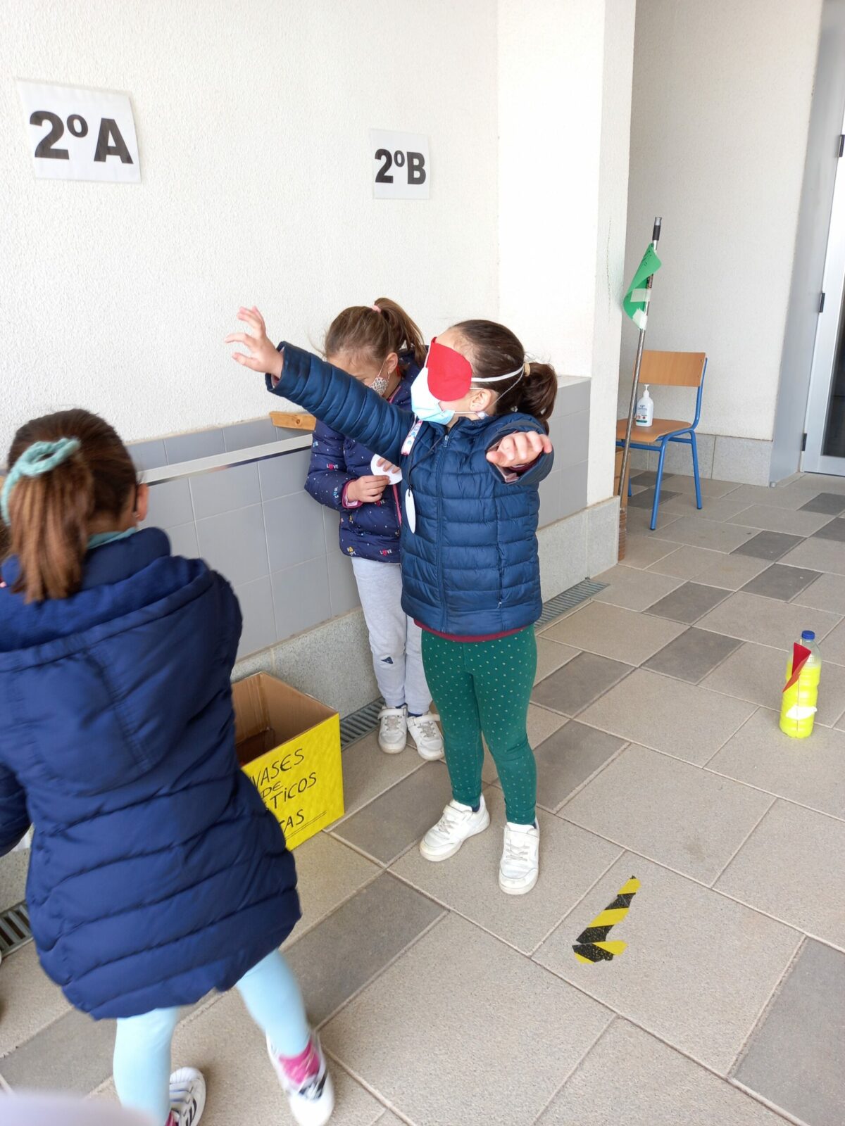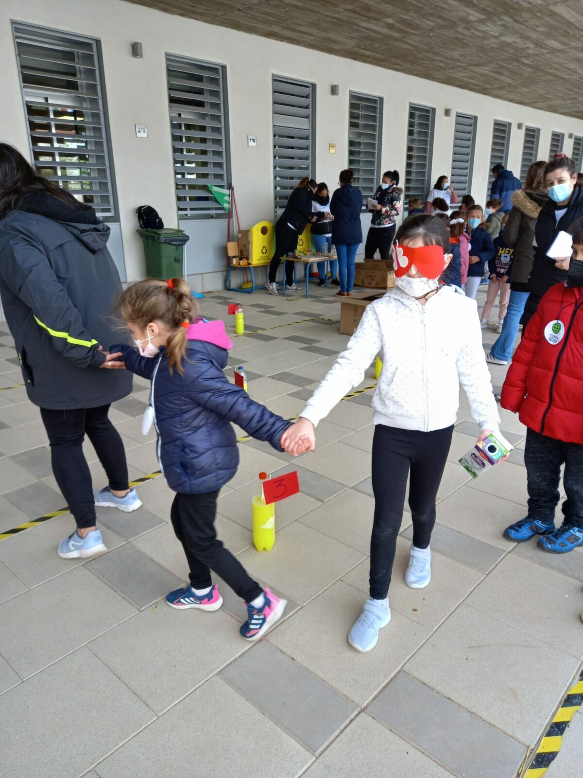 Hubo un circuito de obstáculos que realizaron en parejas. La prueba “amarillo-plástico” consistía en que un miembro de la pareja guiaba al otro, que tenía los ojos vendados, llevando botellas en sus manos que debía depositar en el contenedor amarillo situado al final del recorrido.