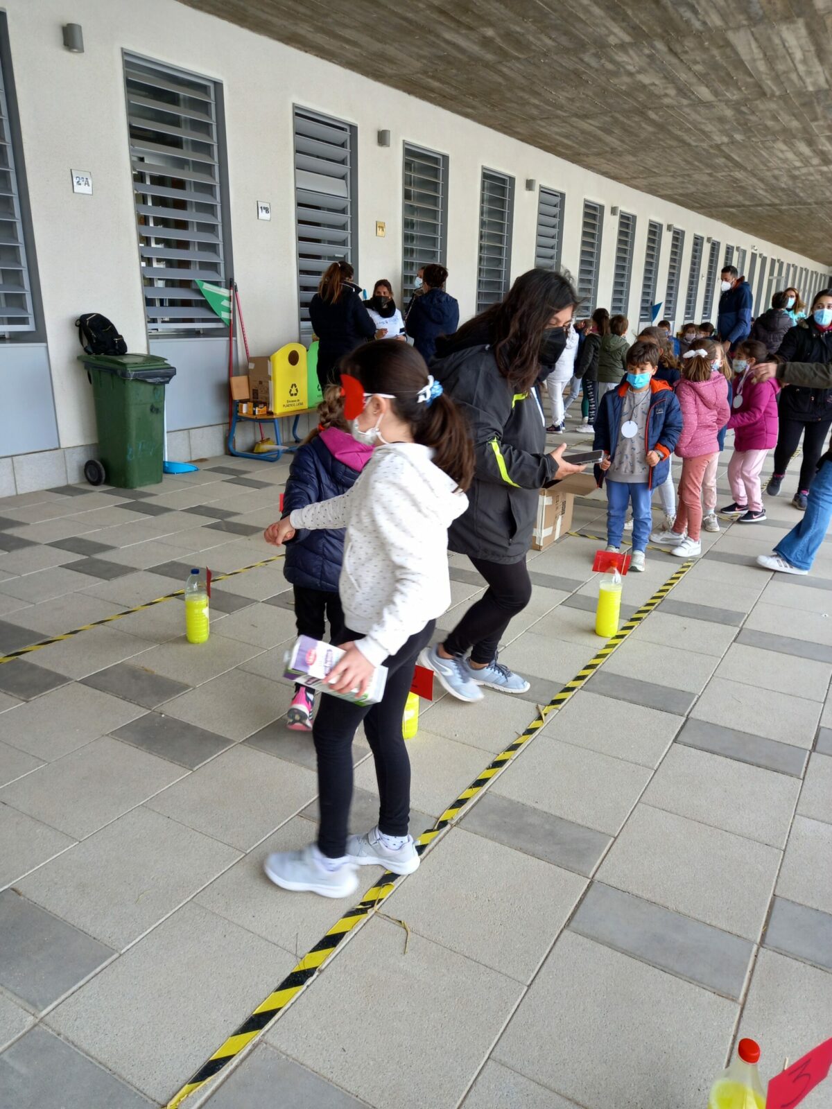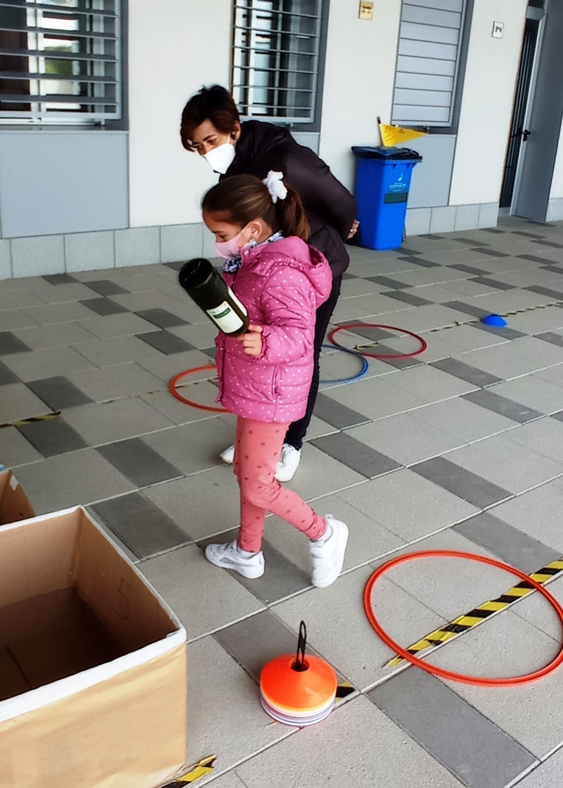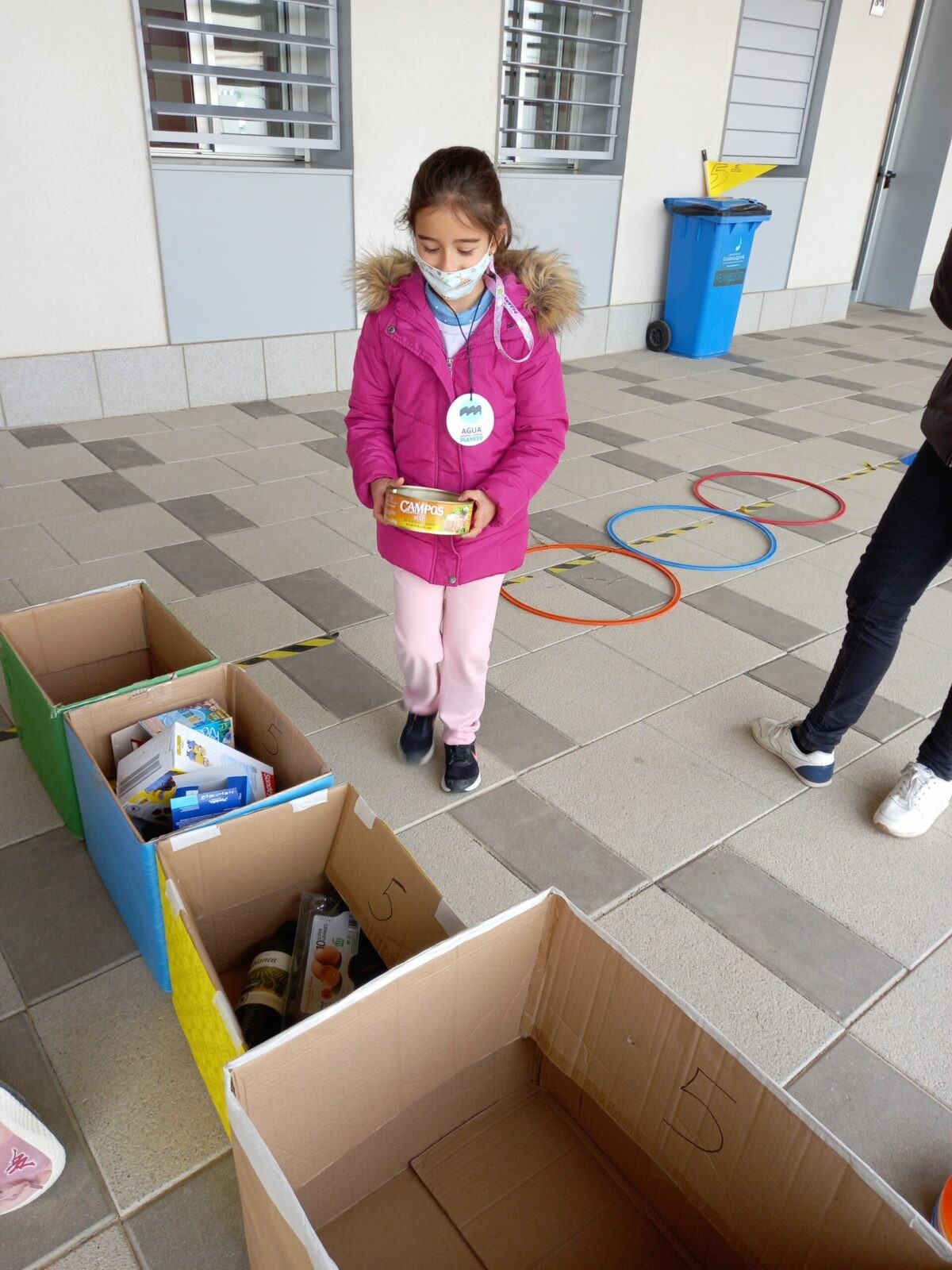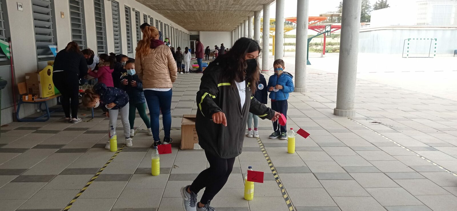 La última prueba, “mix-reciclaje”, constaba de dos fases. En la primera, el alumnado tenía que contestar a una pregunta sobre reciclaje, relacionada con la charla previa, impartida por dos miembros de la AMPA. Una vez acertaban, pasaban a la segunda parte en la que cada se les entregaba imágenes relacionadas con productos para reciclar y ellos/as debían depositarlos en el contenedor que correspondiera, desplazándose por un circuito de aros en el que conseguía puntos.