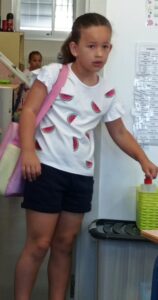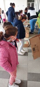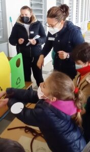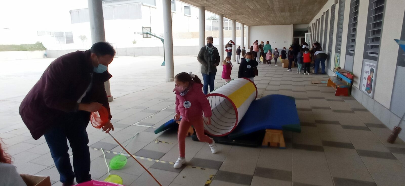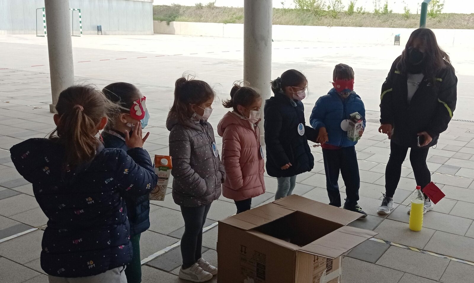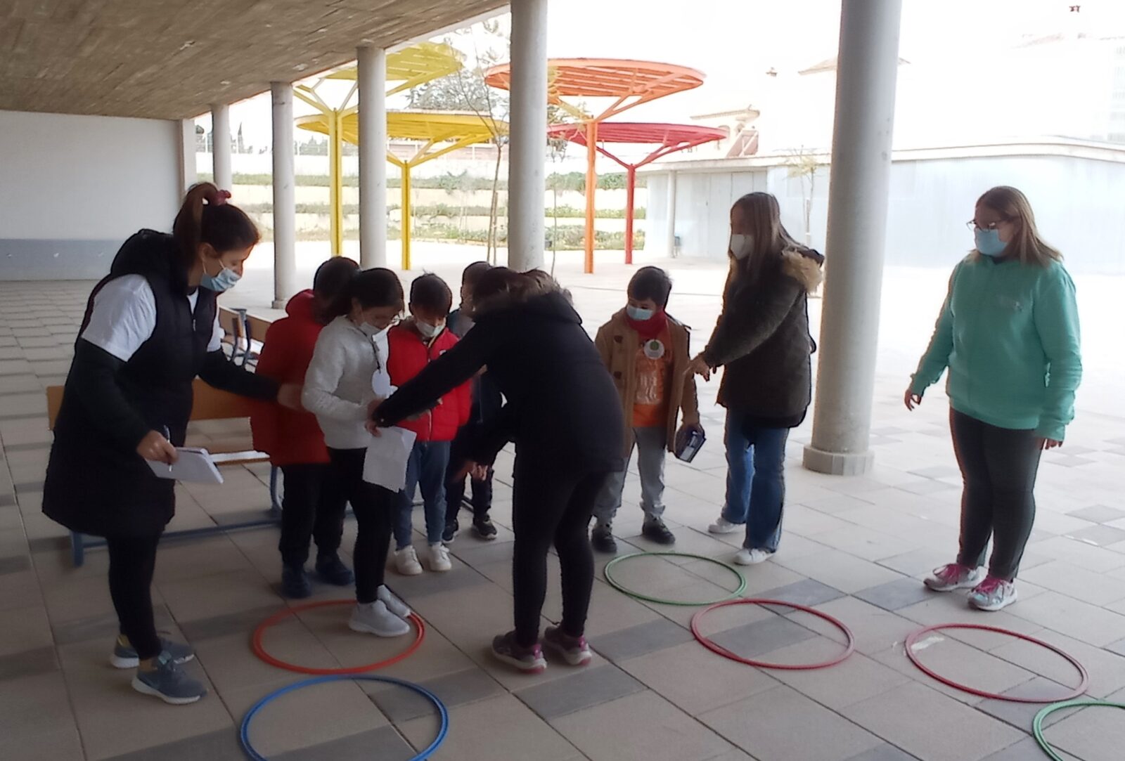 La última prueba, “mix-reciclaje”, constaba de dos fases. En la primera, el alumnado tenía que contestar a una pregunta sobre reciclaje, relacionada con la charla previa, impartida por dos miembros de la AMPA. Una vez acertaban, pasaban a la segunda parte en la que cada se les entregaba imágenes relacionadas con productos para reciclar y ellos/as debían depositarlos en el contenedor que correspondiera, desplazándose por un circuito de aros en el que conseguía puntos.