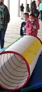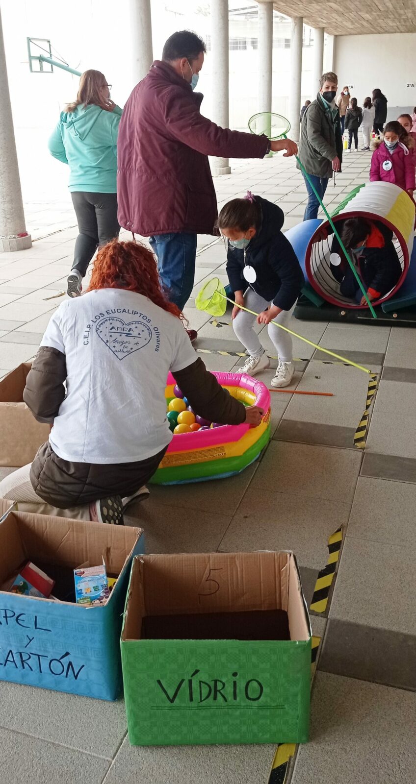 A continuación estaba la prueba “marrón-orgánico”, que consistía en hacer un pequeño recorrido, pasando por un túnel y a la salida del mismo había una pequeña piscina llena de bolas y envases con distintos puntos que tenían que pescar con el cazamariposas y echar cada envase en el contenedor correspondiente.