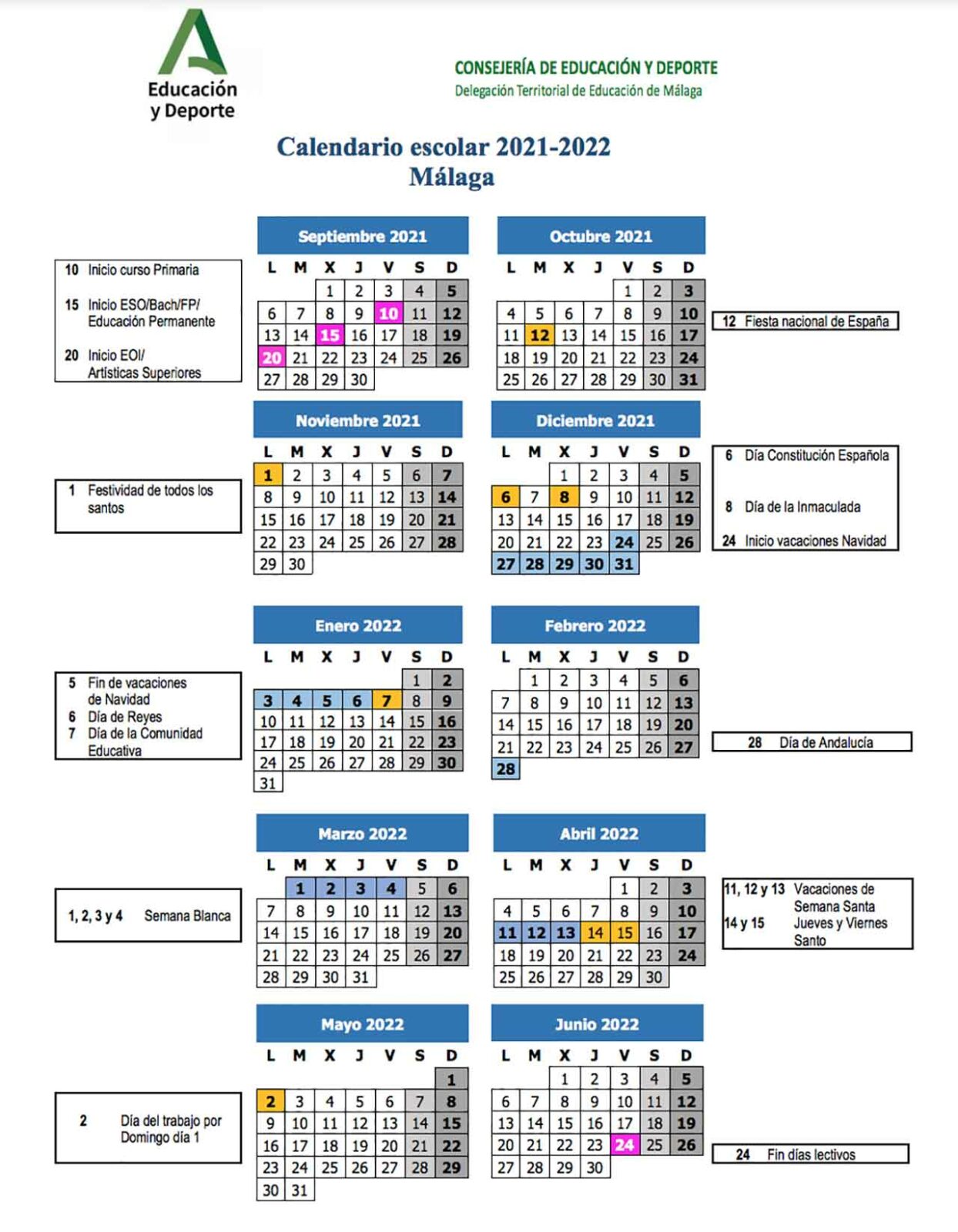 CALENDARIO ESCOLAR CURSO 2021/2022