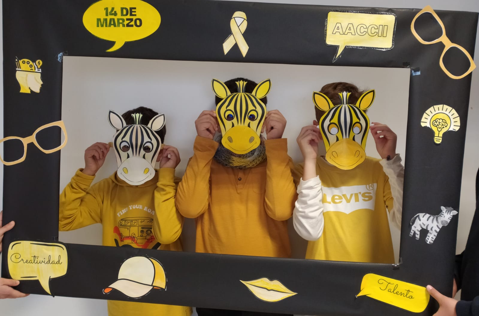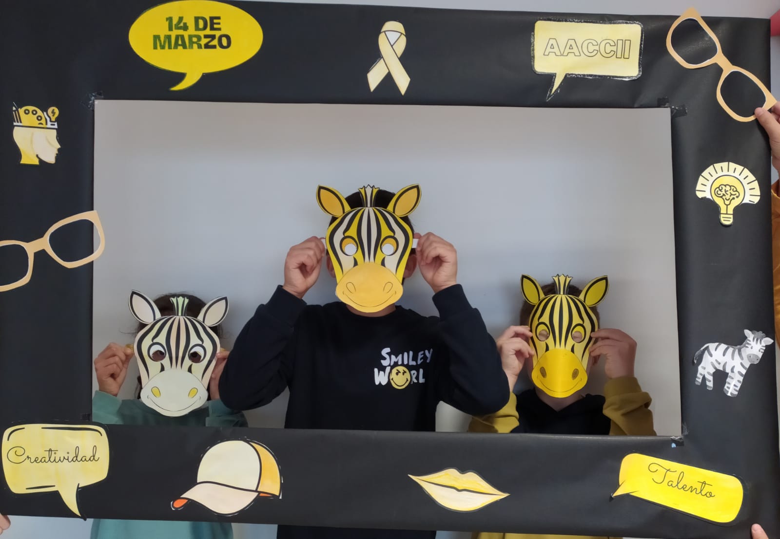 El 14 de marzo fue el Día de las Altas capacidades y desde el taller de enriquecimiento se hizo un photocall y unas caretas para que las tutorías que quisieran se hicieran una foto utilizando las mismas. Se avisó a las familias de que el color de este día es el amarillo por si querían traer de ropa algo de ese color. Con ello intentamos darle visibilidad al alumnado de aaccii.