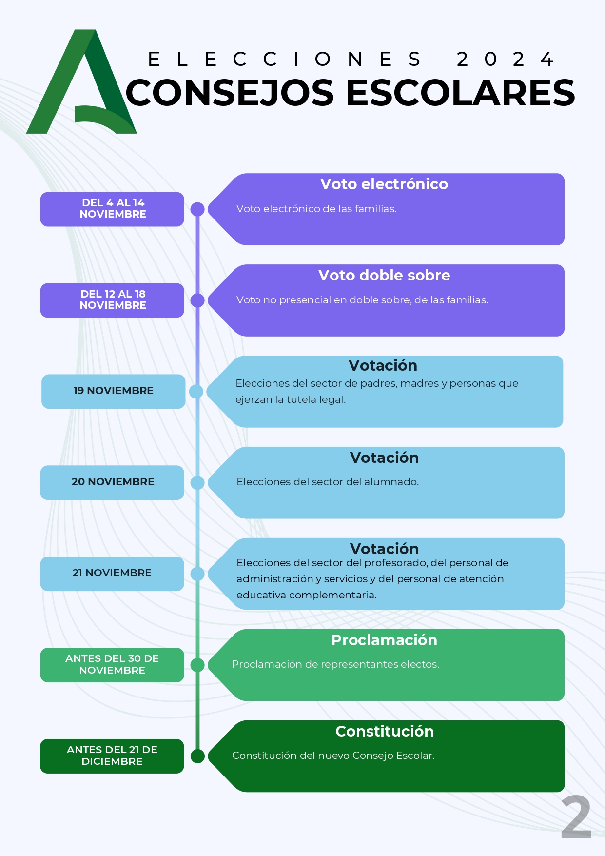 Durante este curso 2024-2025 están convocadas elecciones de representantes en los Consejos Escolares de los centros docentes sostenidos con fondos públicos de la Comunidad Autónoma de Andalucía, a excepción de los centros específicos de educación permanente de personas adultas.