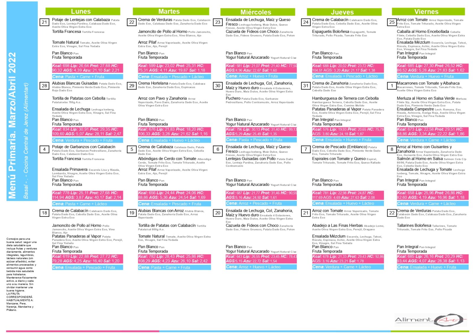 Os dejamos el Menú Escolar del 22 de marzo al 22 de abril.