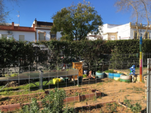El patio consta de una pista de deporte y dos areneros con juegos infantiles.