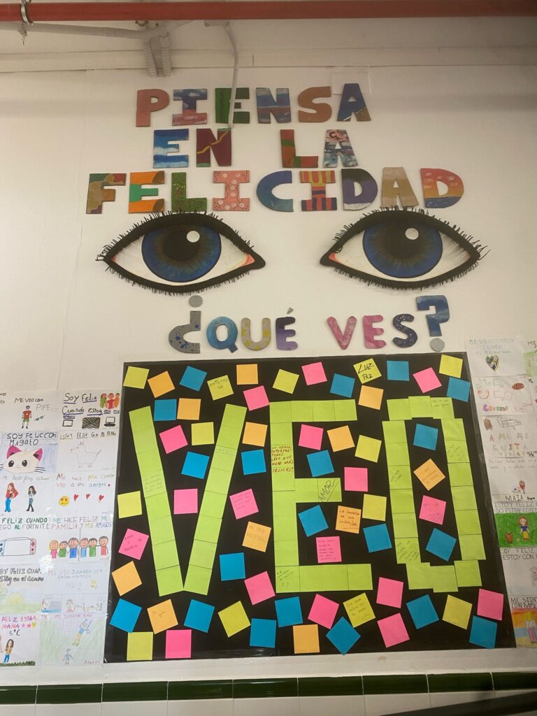 Este mural, presidido por dos grandes ojos y la pregunta “¿Qué ves?”, nos invita a detenernos un instante y reflexionar sobre aquello que nos hace felices. Bajo esta gran pregunta, los adultos comparten sus pensamientos en notas adhesivas formando la palabra “VEO”, creando así un colorido testimonio de los diferentes motivos que despiertan alegría en cada persona.