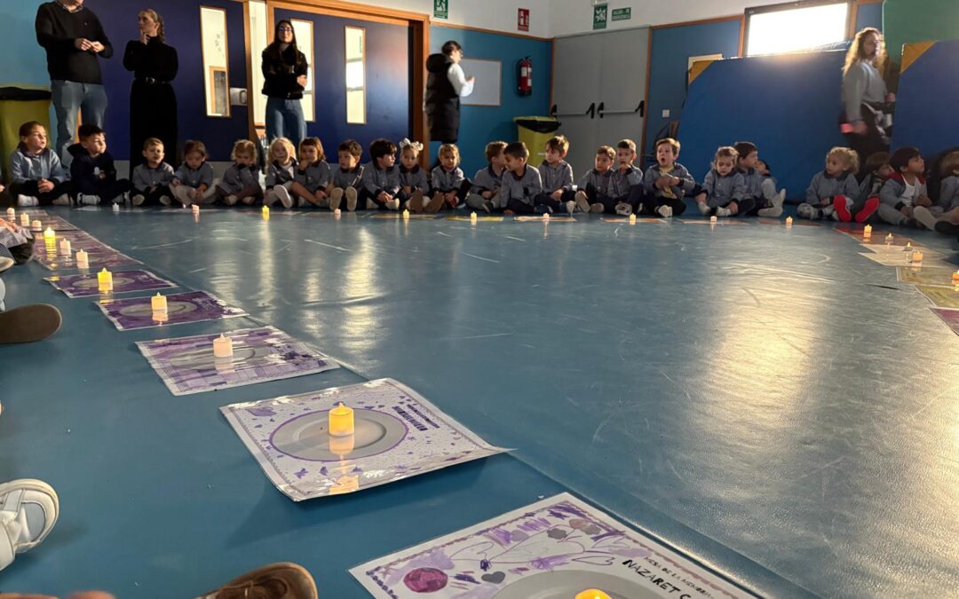 Estos manteles se han colocado en el SUM formando un gran triángulo. Entre una iluminación con 27 velas alumnado de sexto curso han leído un relato adaptado a la edad del alumnado, explicando el significado de esta conmemoración