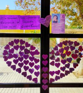 Como actividad de centro, hemos hecho un gran corazón violeta formado a su vez por corazones pequeños con palabras y frases contra la violencia y lo hemos pegado en la cristalera de la puerta principal, todo el que entre al colegio, tiene que verlo. También se ha hecho en el edificio de infantil.