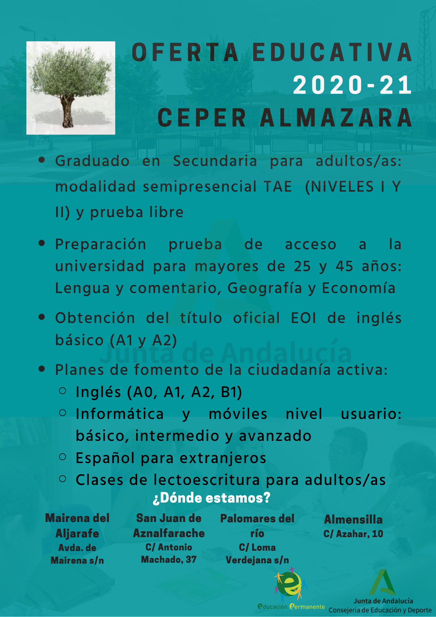 - CEPER Almazara (Avda. de Mairena s/n Mairena del Aljarafe): Lunes a viernes de 12:00 a 13:30. Para ser atendido/a en el centro de Mairena y evitar esperas recomendamos reservar cita previa accediendo al siguiente enlace: