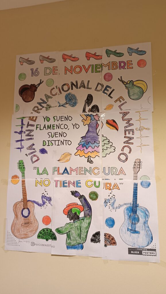 Una de las actividades centrales fue la creación de un mural colaborativo sobre el flamenco. Nuestros alumnos y alumnas transformaron una pared en un lienzo vibrante, donde plasmaron su visión de este arte universal. Desde los volantes de un vestido de gitana hasta el perfil de un cantaor, pasando por las formas de una guitarra y el ritmo de las palmas.