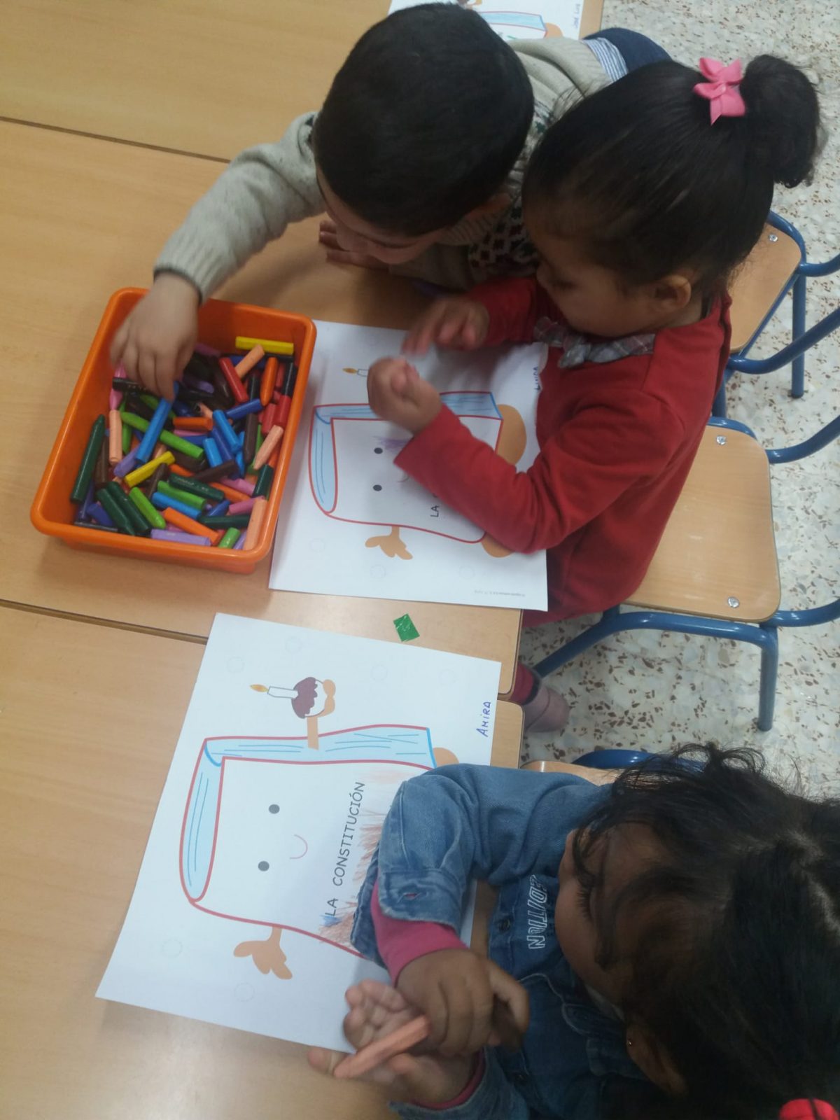 Asambleas para trabajar los derechos y deberes del colegio y visionado de videos como «El patio de la Constitución» y «El cumpleaños de la Constitución».Infantil 3 AÑOS coloreó un libro de la Constitución; 4 AÑOS, coloreó una bandera y 5 AÑOS hizo una lámina alusiva a la Constitución.