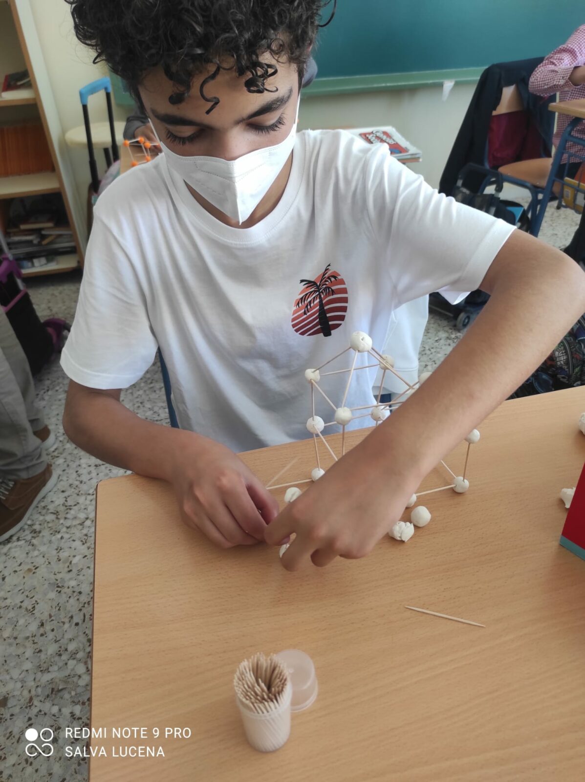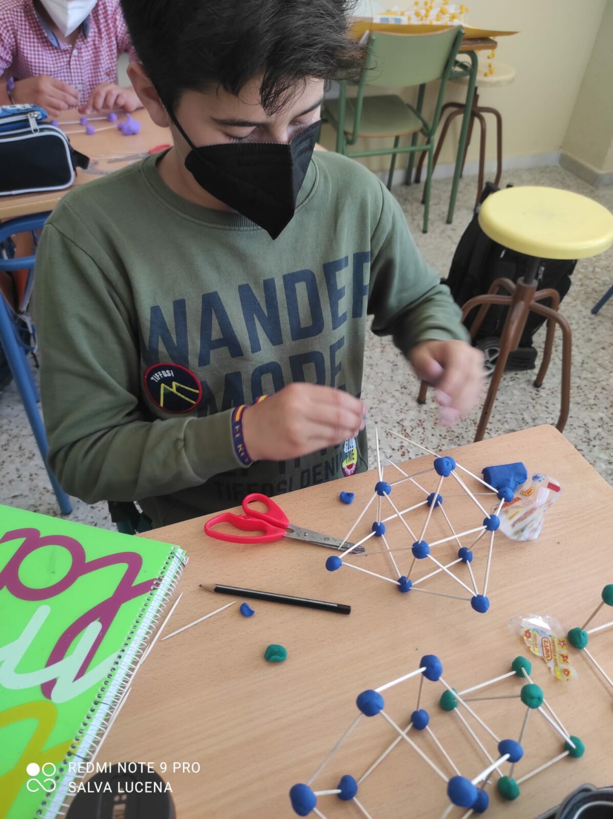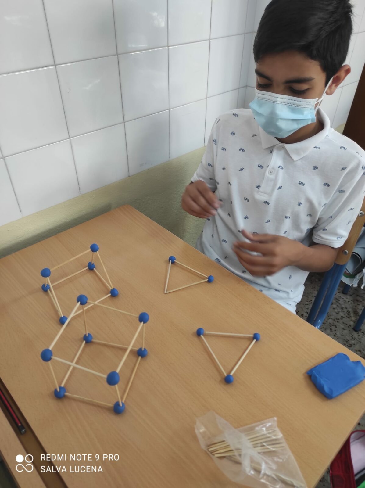 En sesiones posteriores, empezamos a construir los distintos cuerpos de forma manipulativa con plastilina y palillos de madera, y así pudieron visualizar sus caras, aristas, vértices, diferencias y semejanzas. He aquí algunas fotos de la sesión en la que disfrutaron mucho e incluso crearon sus propios cuerpos: