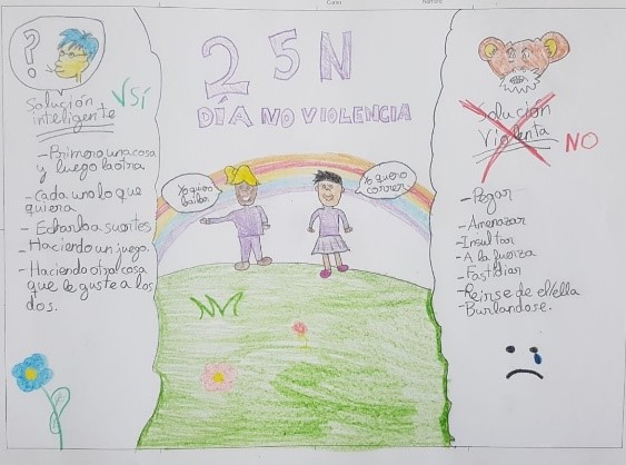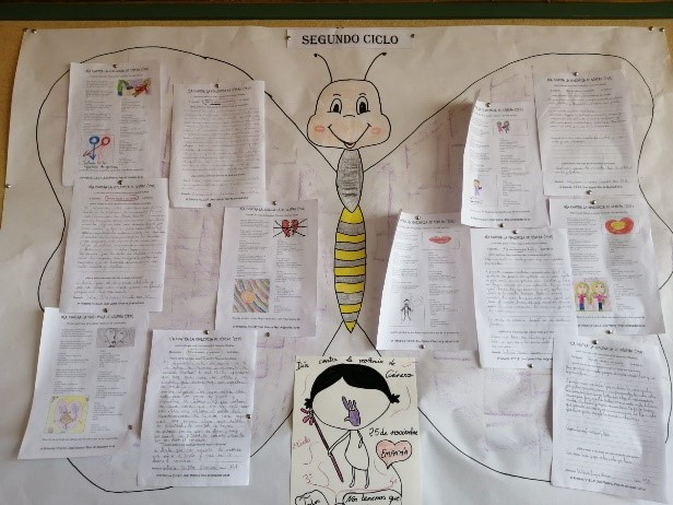 En el 2º y 3º ciclo, se trabajaron diferentes situaciones en relación a la imposición de criterios o acciones por parte del hombre hacia la mujer. Se debaten en asambleas las situaciones y se buscan soluciones a dichas situaciones. Se confeccionaron murales de autoestima en el 3º ciclo y de mensajes positivos en el 2º ciclo.