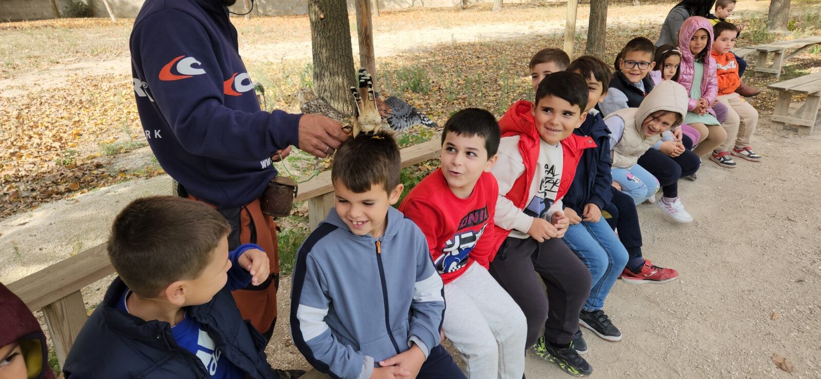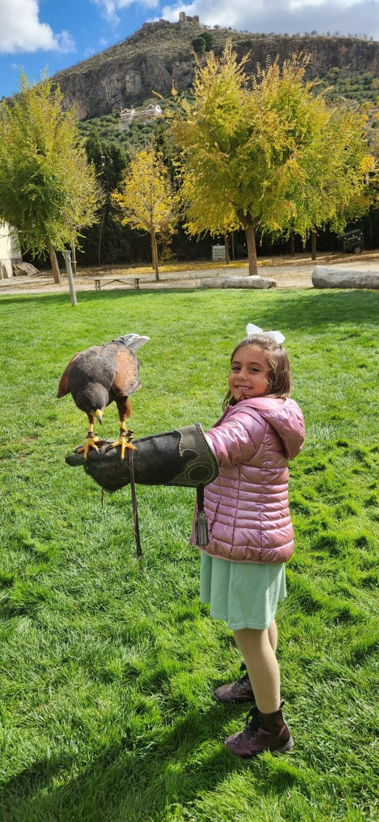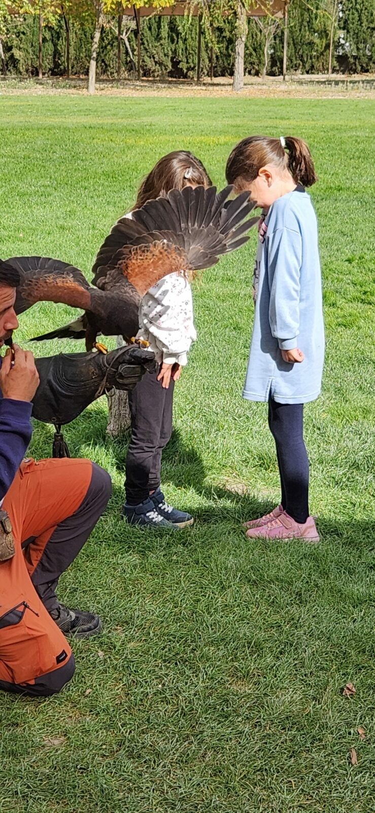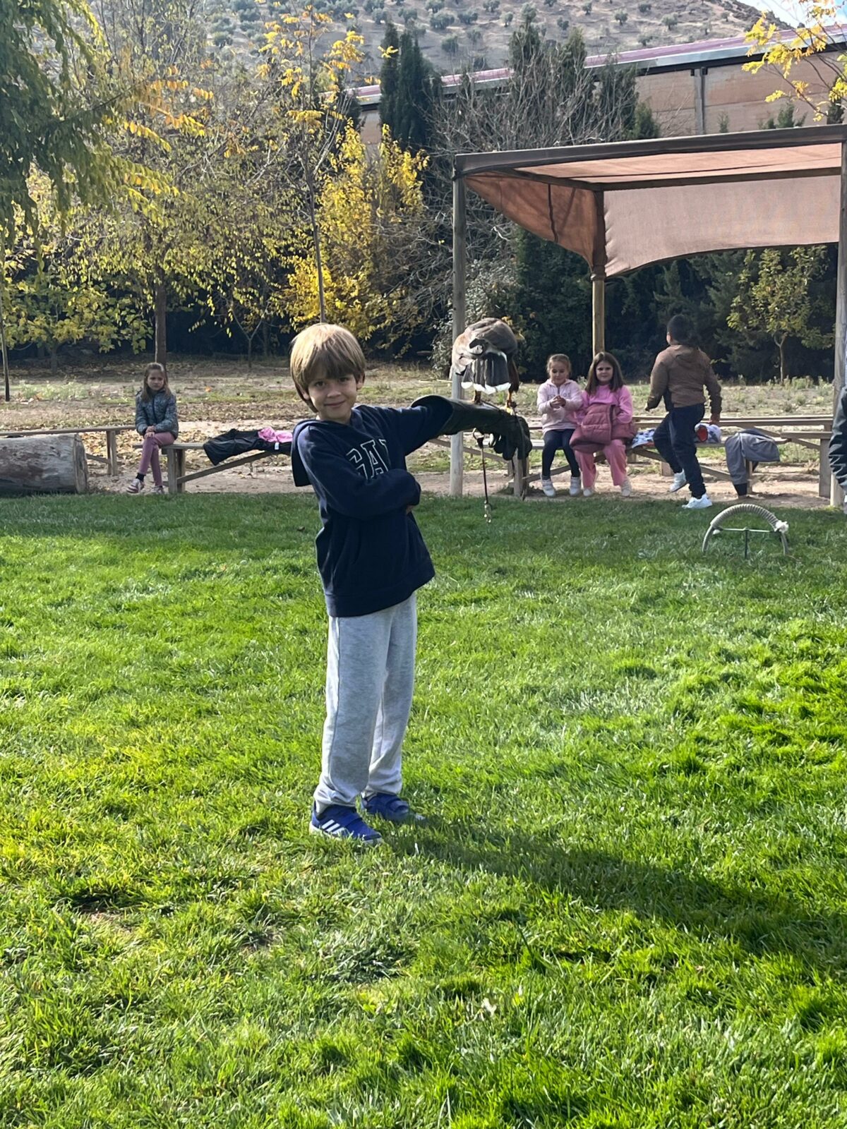 Además, participaron en un taller de creación de lanzas con puntas de sílex, así como un taller de cetrería con aves rapaces, en el que quedamos impresionados/ as con las habilidades de estos animales, incluso tuvieron la oportunidad de alimentar y coger a un águila. Vieron las jaulas de animales de la granja escuela, acercándose a una impresionante avestruz, acariciando al burro Jerónimo y jugando con los conejos que criaban.