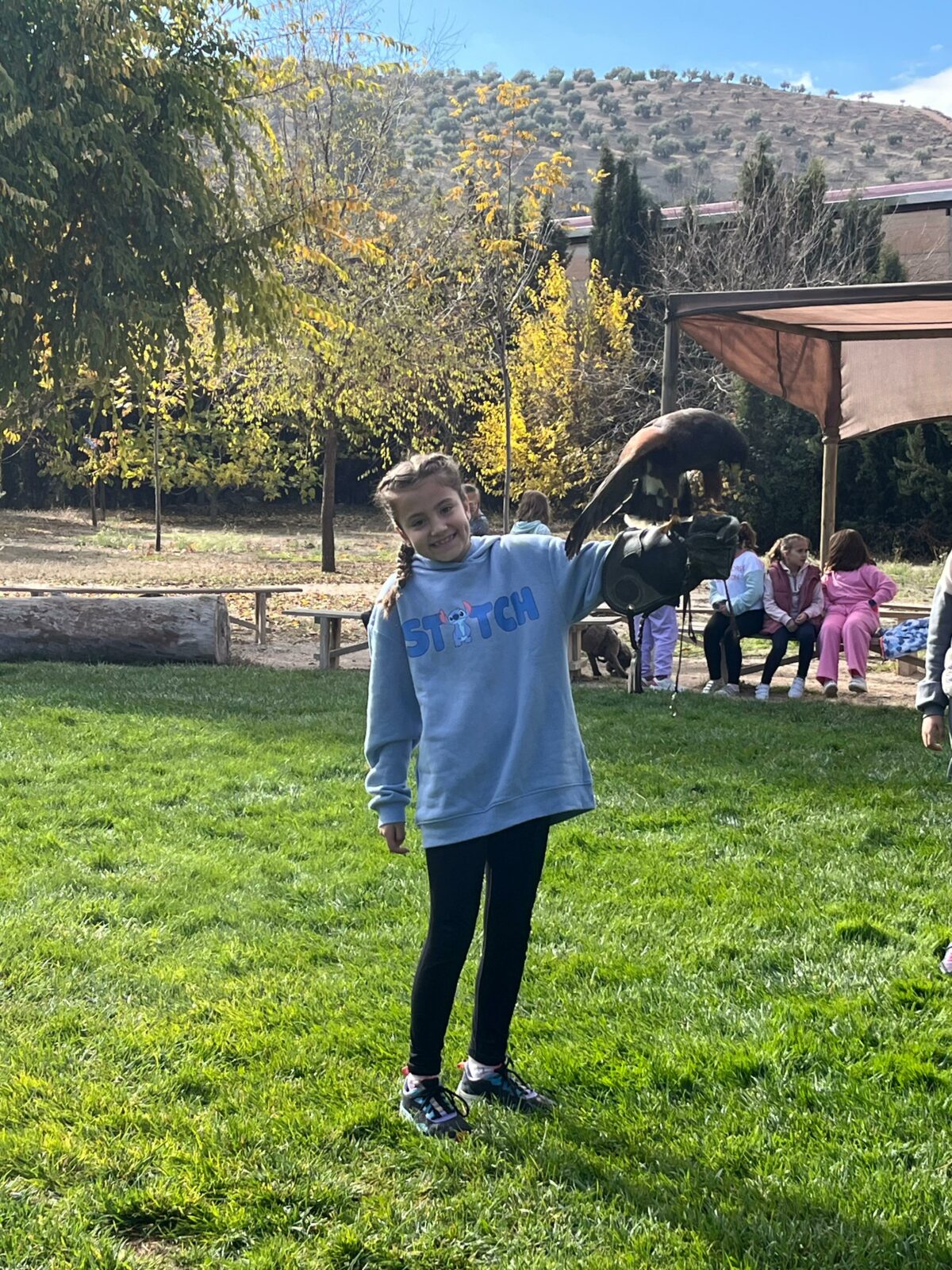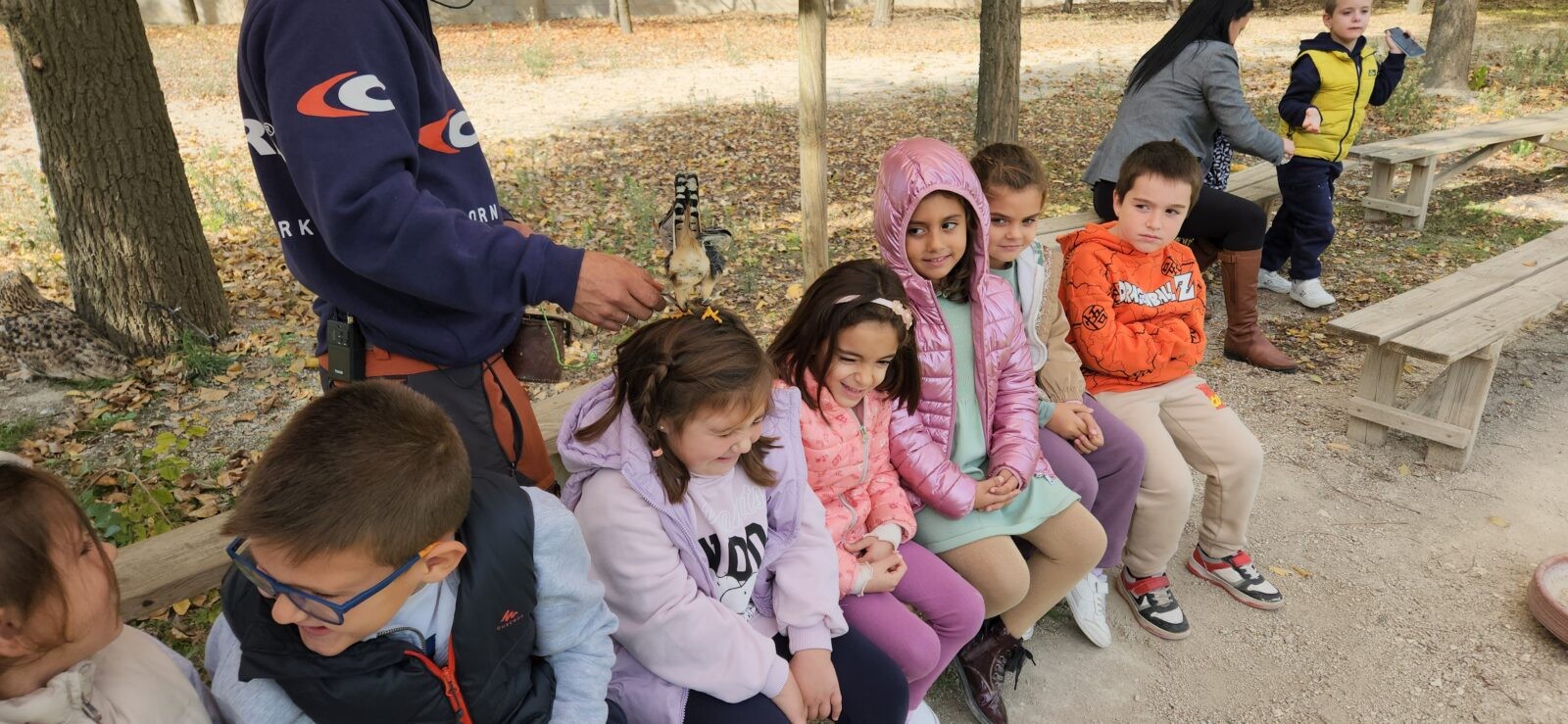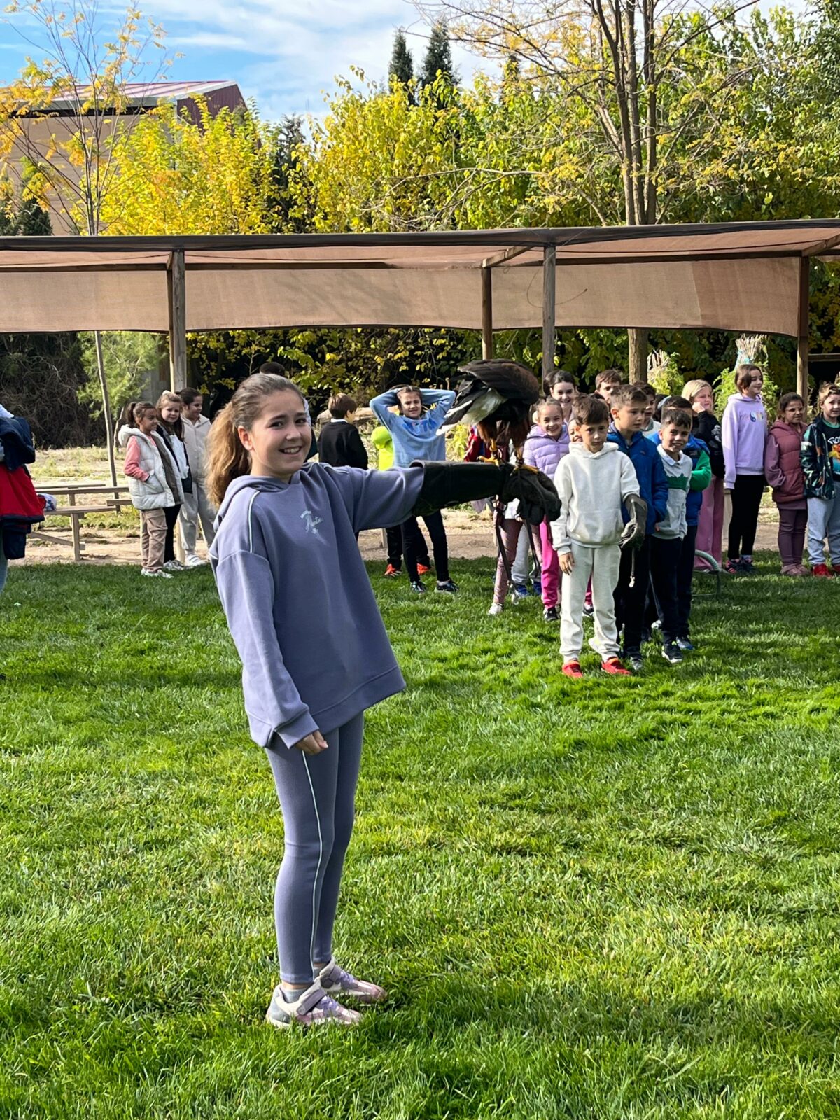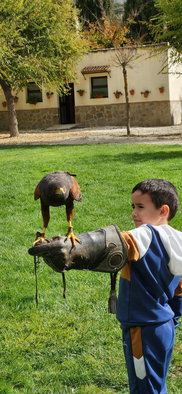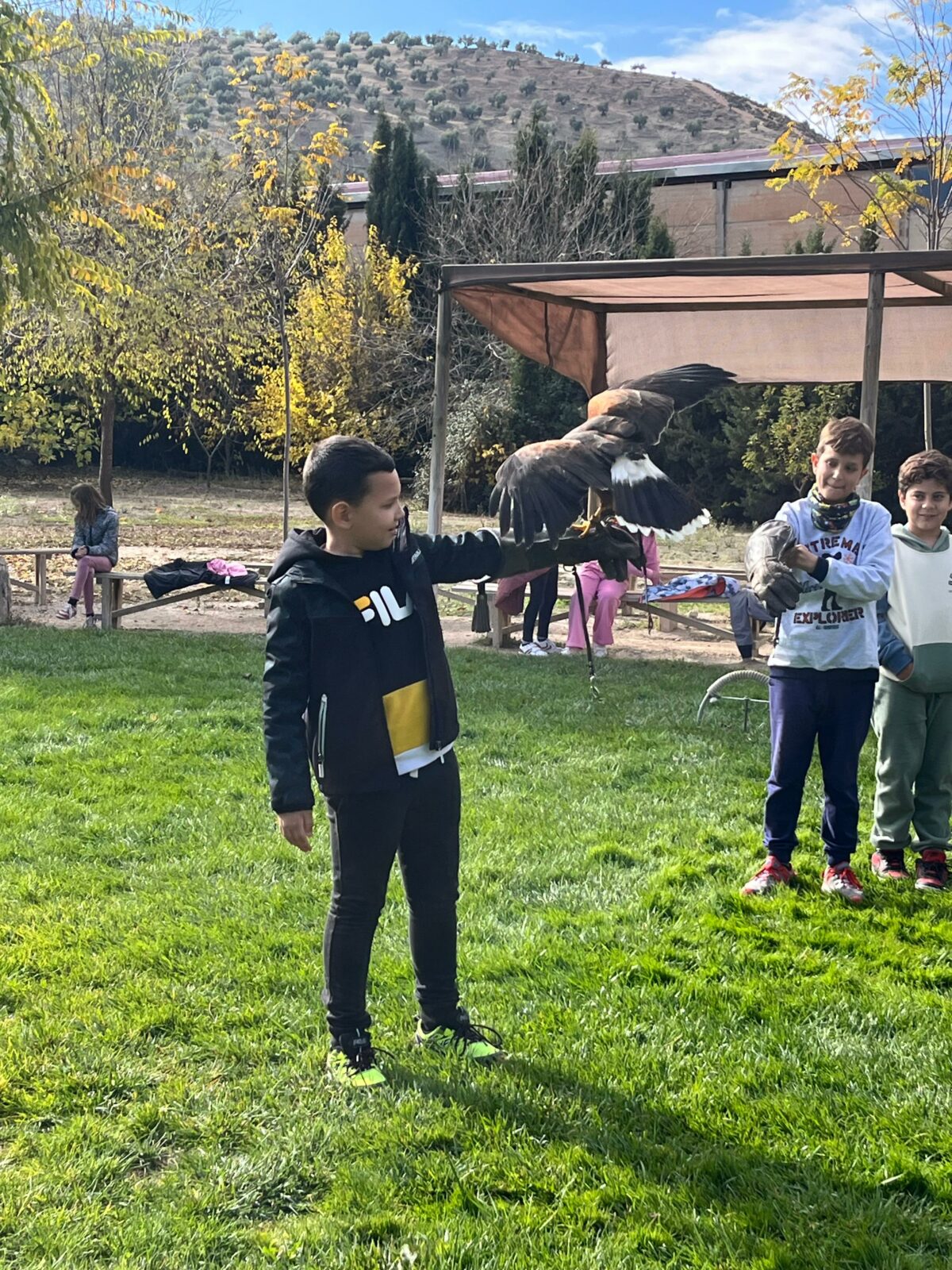 Además, participaron en un taller de creación de lanzas con puntas de sílex, así como un taller de cetrería con aves rapaces, en el que quedamos impresionados/ as con las habilidades de estos animales, incluso tuvieron la oportunidad de alimentar y coger a un águila. Vieron las jaulas de animales de la granja escuela, acercándose a una impresionante avestruz, acariciando al burro Jerónimo y jugando con los conejos que criaban.