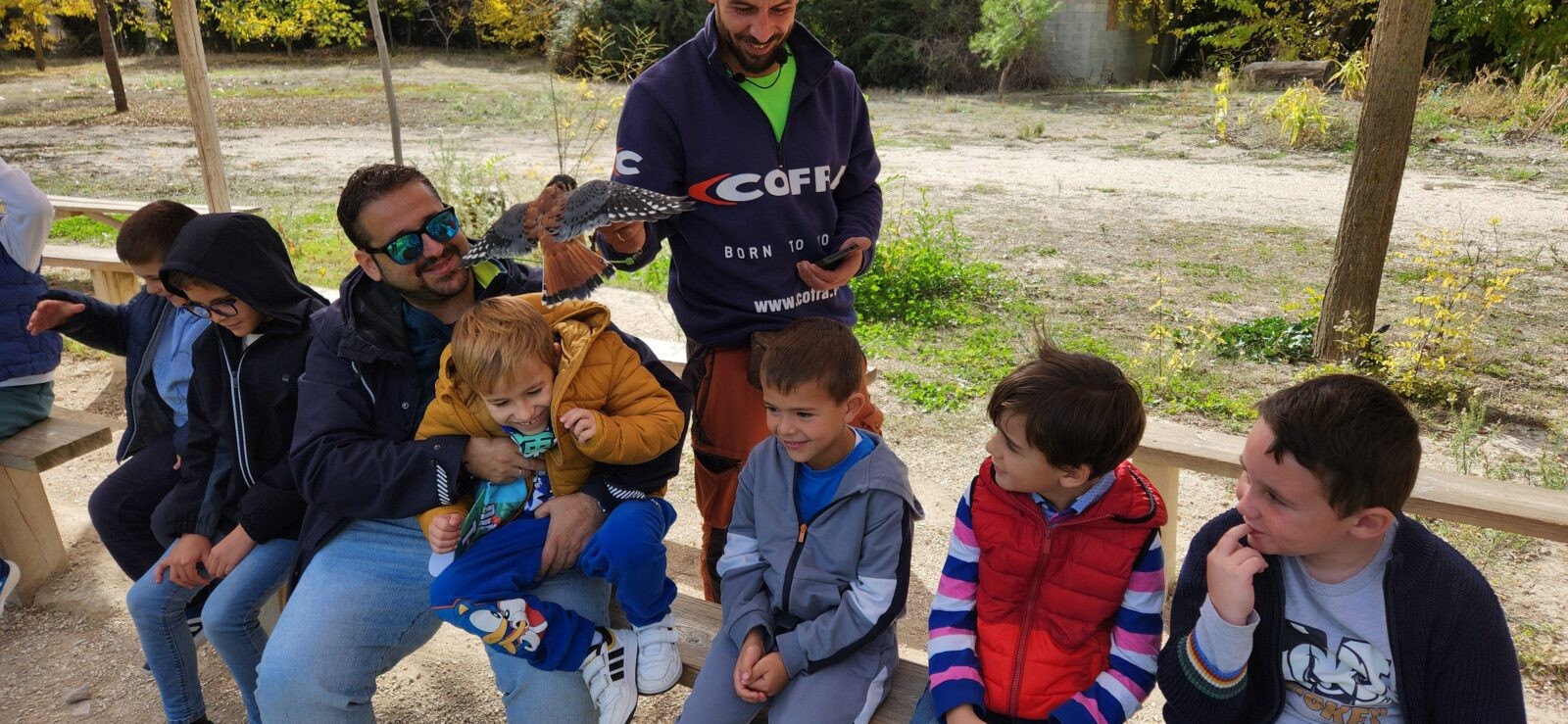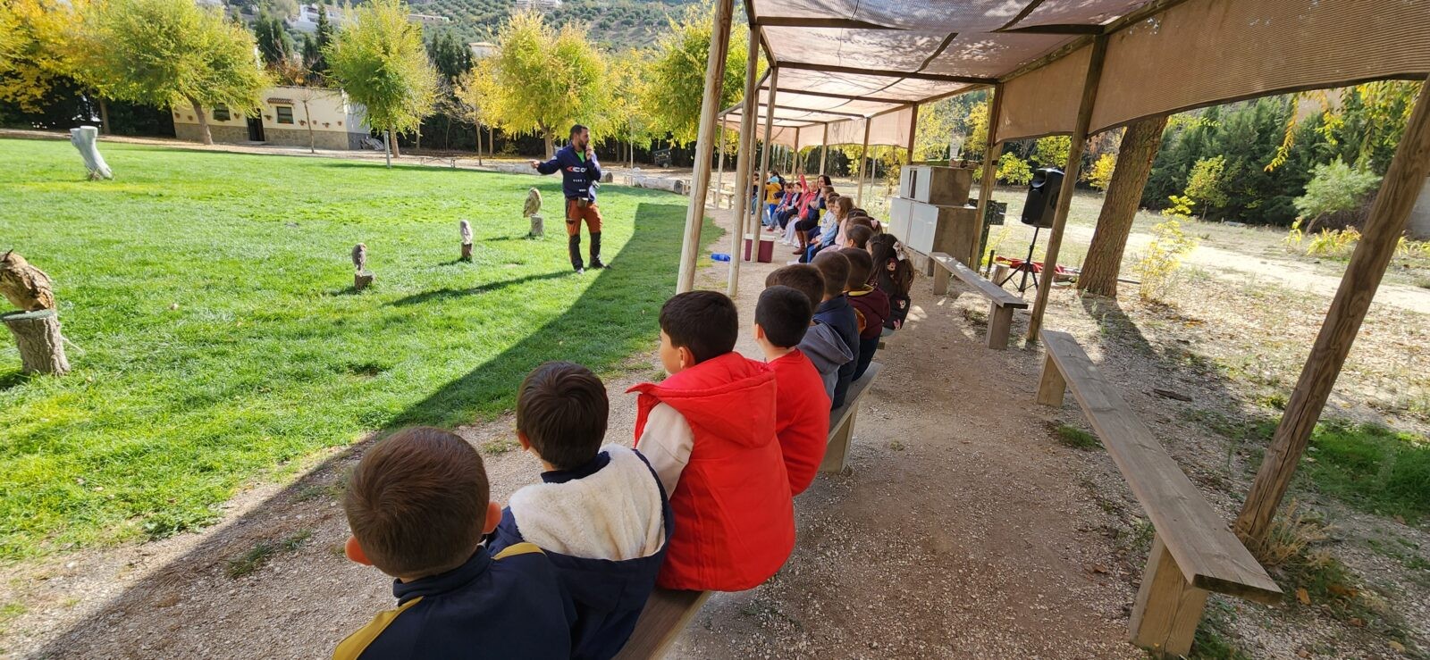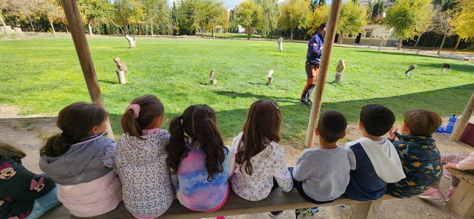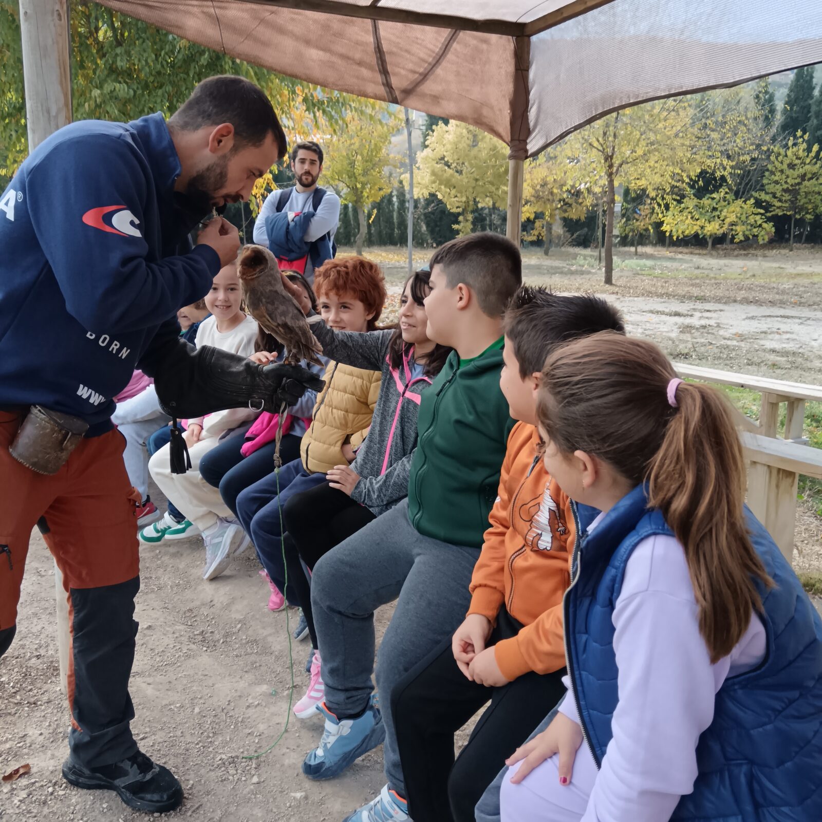 Además, participaron en un taller de creación de lanzas con puntas de sílex, así como un taller de cetrería con aves rapaces, en el que quedamos impresionados/ as con las habilidades de estos animales, incluso tuvieron la oportunidad de alimentar y coger a un águila. Vieron las jaulas de animales de la granja escuela, acercándose a una impresionante avestruz, acariciando al burro Jerónimo y jugando con los conejos que criaban.