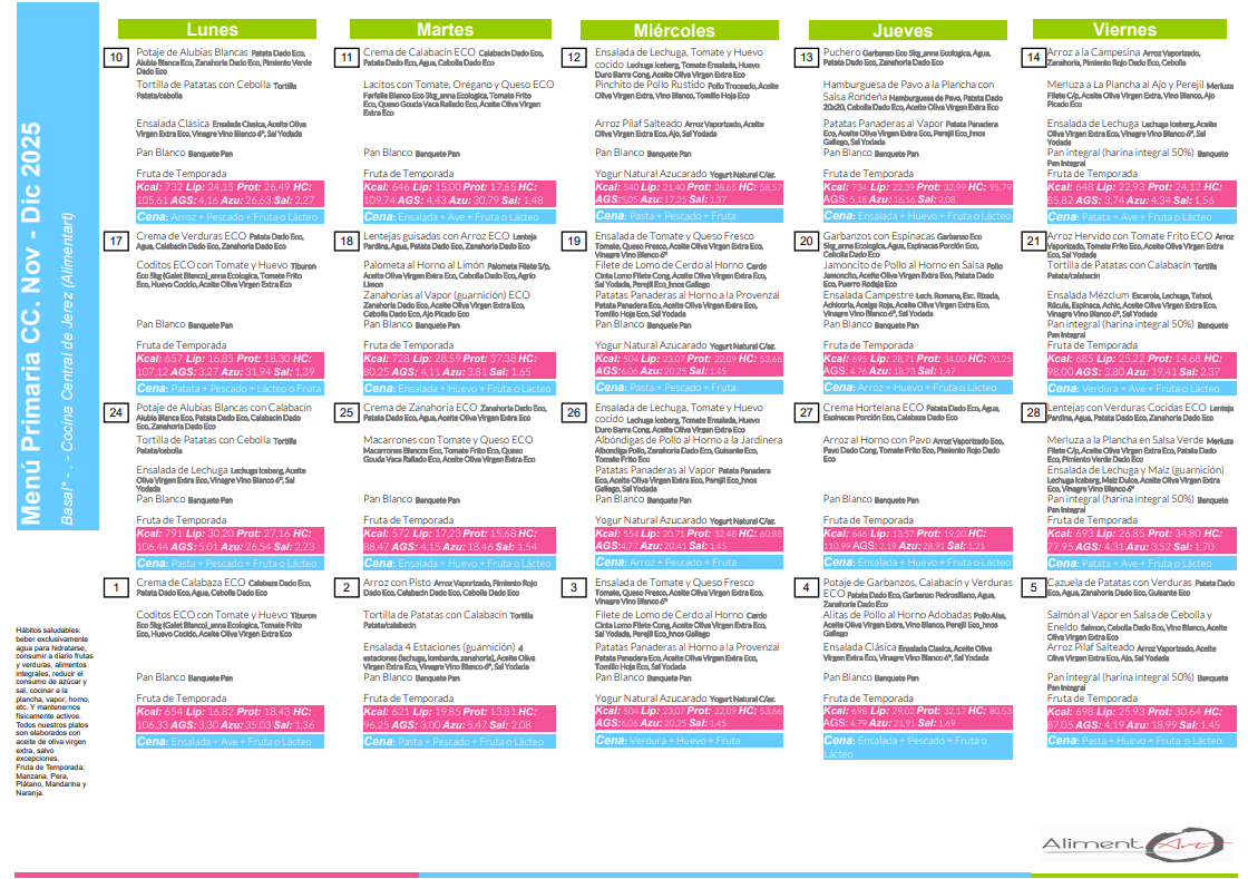 Este es el menú basal que nos ofrece el Catering Mediterránea, para el mes de octubre – noviembre en nuestro comedor escolar del CEIP San Juan Bautista de El Repilado (Jabugo).