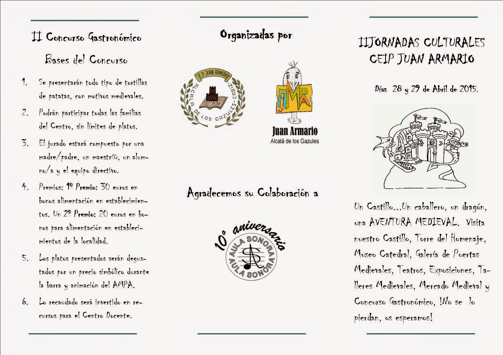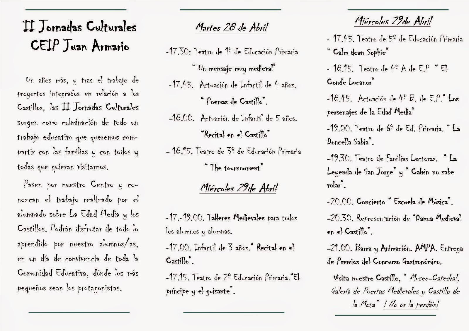 Al fin, aquí lo tenéis. Os recordamos que todos los niños y niñas del colegio, tendrán que venir el Miércoles 29, para realizar la Danza Medieval, en la que participamos todos los maestros, maestras y todos los niños y niñas, y tendrán que venir disfrazados de personajes de la Edad Media.
