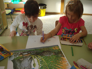 Los demás niños y niñas de clase trabajaban por rincones otros aspectos de los albumnes ilustrados y con ello el proyecto del teatro que hemos empezado recientemente, por ejemplo en un rincón jugaban a las marionetas recordando un cuento tradicional y ensayándolo para después hacer una pequeña actuación con el guiñol.