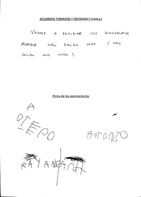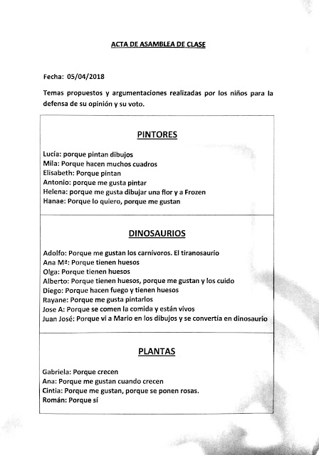 El otro día leyendo un artículo «El acta de la asamblea de clase: un texto escrito a partir de los 3 años» de Isabel Ríos. Febrero 2008. www. casadeleitura.org» se me ocurrió utilizar este tipo de texto para decidir el tema de nuestro próximo proyecto, por los siguientes objetivos que se pueden alcanzar: