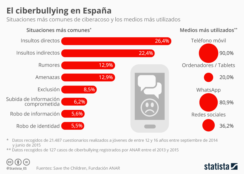 A principios de este año la Organización Mundial de la Salud alertó de que España es uno de los países donde más ciberacoso sufren los menores. El acoso escolar a través de medios tecnológicos es un problema extendido en el país. Según el informe ‘Yo a eso no juego’ elaborado por Save the Children, el 6,9% de los alumnos de entre 12 y 16 años encuestados lo han sufrido. Las chicas salen peor paradas con un 8,5%, mientras que en los chicos la cifra es de 5,3%. Como esta infografía de Statista muestra, las formas de ciberbullying más comunes son los insultos directos e indirectos, los rumores y las amenazas. En cuanto a los medios utilizados para el acoso, la fundación ANAR informa de que la mayoría de casos se llevan a cabo a través del móvil y utilizando Whatsapp. La infografía ha sido publicada en este artículo de El Diario.