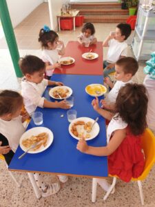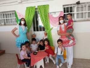 Hoy comemos comida típica de Feria, croquetas, lagrimitas, patatas fritas, tortilla de patatas, aceitunas, queso, y de postre helado.
