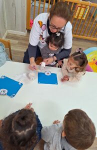 Los bebes han estado jugando con las telas y en el cesto de clase, que hemos colocado unas gomas, tienen que intentar sacar los objetos que hay dentro, desarrollando así su psicomotricidad y destreza.