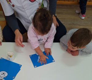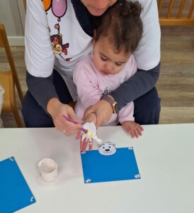 Y en la actividad de hoy hemos empezado a hacer con algunos niños/as de la clase, la huella de su mano, en una cartulina decorada con la cara de un Oso, ellos con su mano le van haciendo el cuerpo.