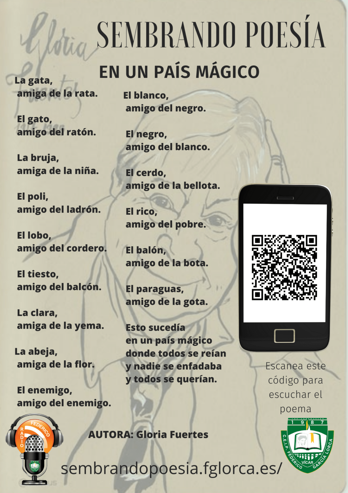 Tras la experiencia del curso pasado, volvemos a Sembrar Poesía. Aprovechando el Día Mundial de la Poesía, hemos pensado en difundirla en el municipio de Vícar. Durante el trimestre, hemos grabado unos poemas de Gloria Fuertes y subido a nuestra Radio Escolar a modo de podcast. Posteriormente hemos preparado unas tarjetas que queremos “plantar” por el municipio. En las tarjetas pondremos unos códigos QR, que al leerlos con cualquier móvil, mostrarán la web del centro, y se podrá escuchar nuestras poesías, así como información de los poemas.